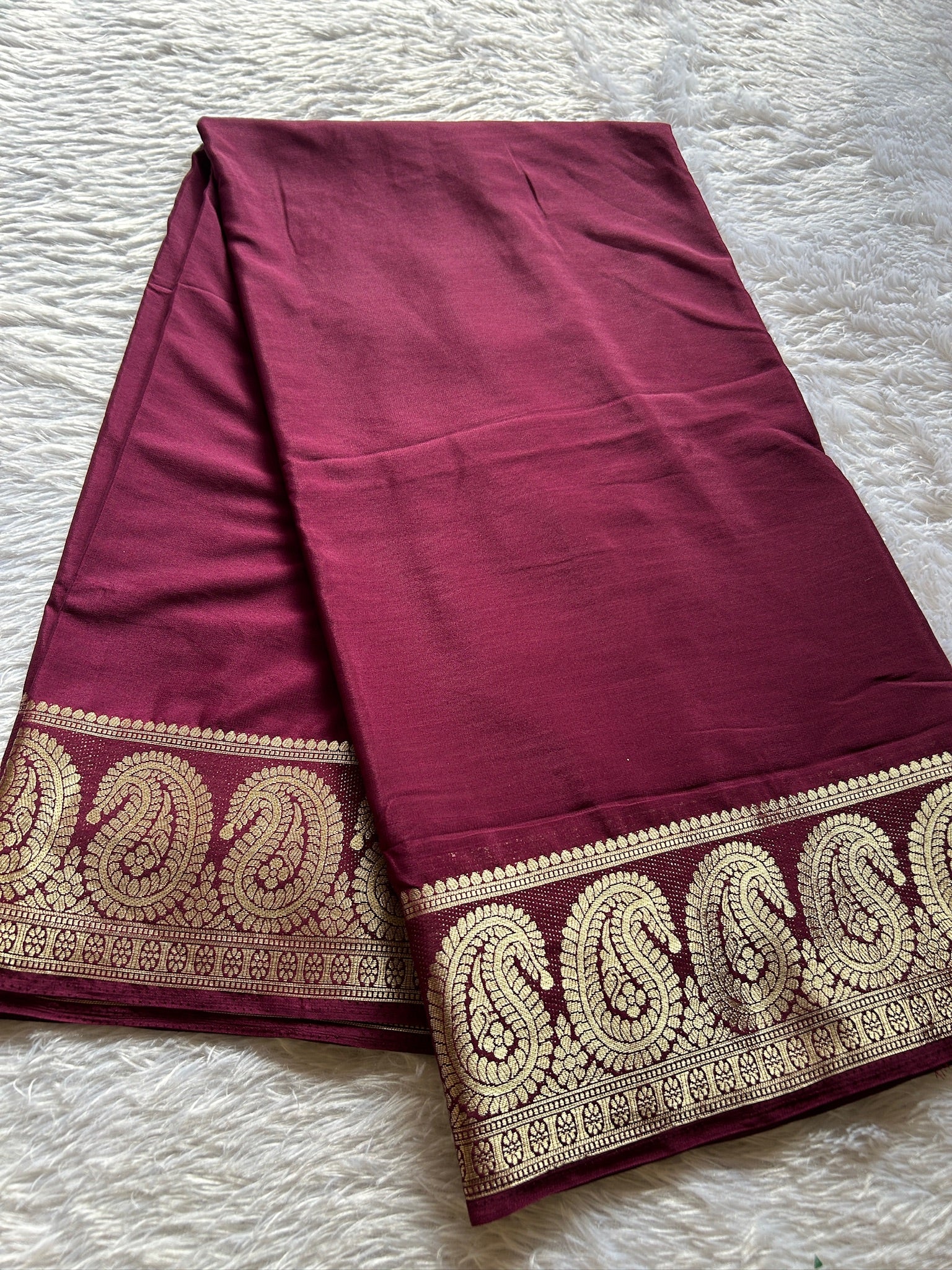This elegant semi crepe silk saree in a wine hue features a striking mango border, blending traditional artistry with refined texture. Its smooth, lightweight fabric drapes gracefully, ensuring comfort while enhancing the saree's vibrant appeal. Perfect for formal occasions, this piece exemplifies timeless craftsmanship and subtle sophistication.