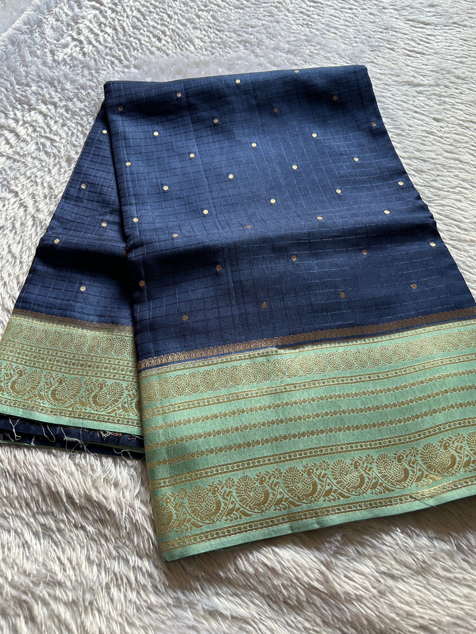 This deep blue semi-soft silk saree features a subtle checkered texture adorned with delicate small buttas throughout. Its aqua mint border is intricately detailed with exquisite zari work showcasing peacock and paisley motifs, adding a refined elegance. The saree’s pallu is beautifully embellished with intricate zari designs, highlighting craftsmanship that suits formal and festive occasions with grace and sophistication.