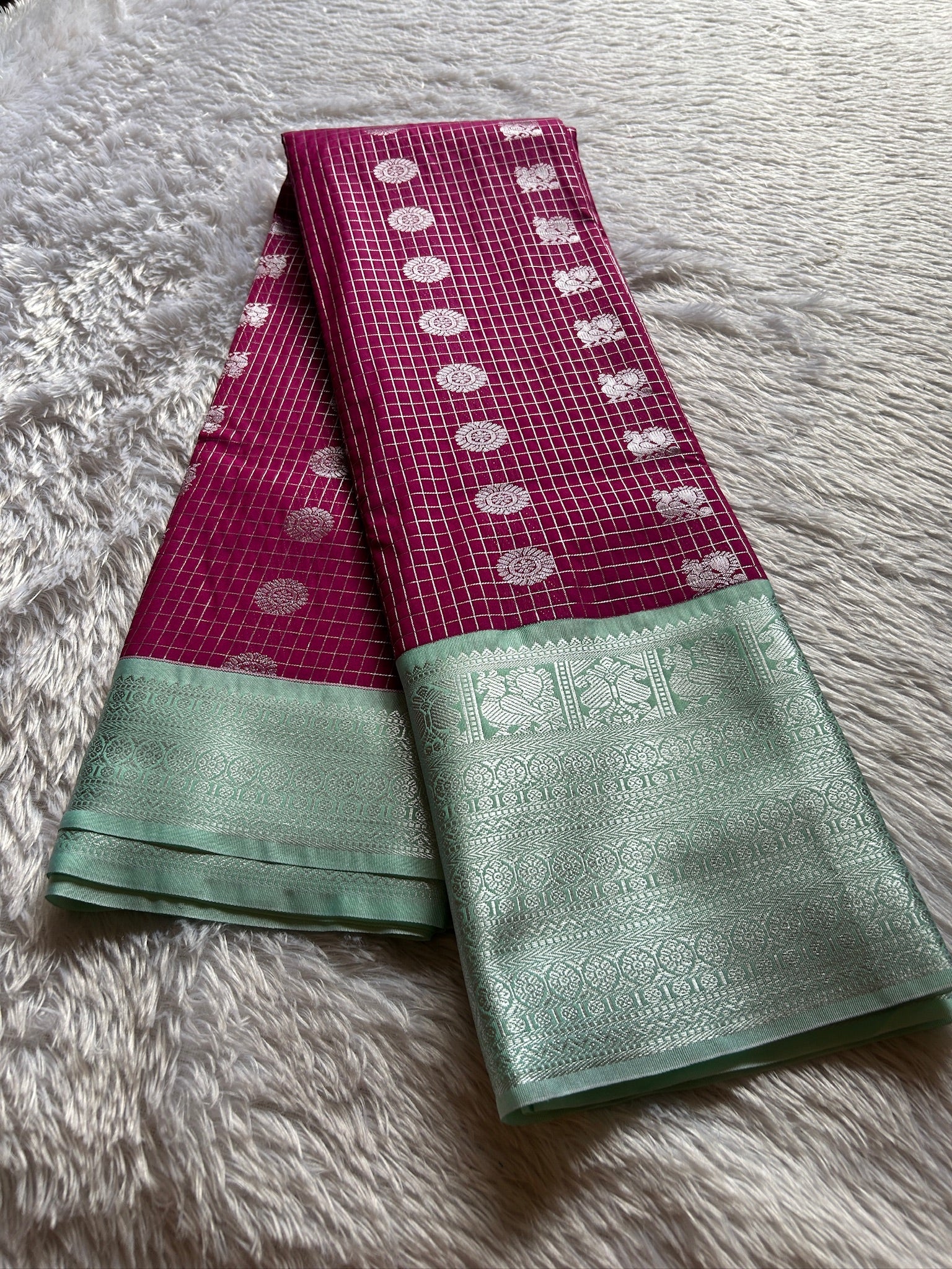 Elevate your wardrobe with this maroon semi-soft silk saree, delicately adorned with small silver zari checks. Featuring intricate peacock and floral buttas, it showcases expert craftsmanship. The saree is complemented by a stunning silver zari work pallu and a fresh mint green border enhanced with matching silver zari detailing, combining tradition with elegant contrast for a refined, timeless look.