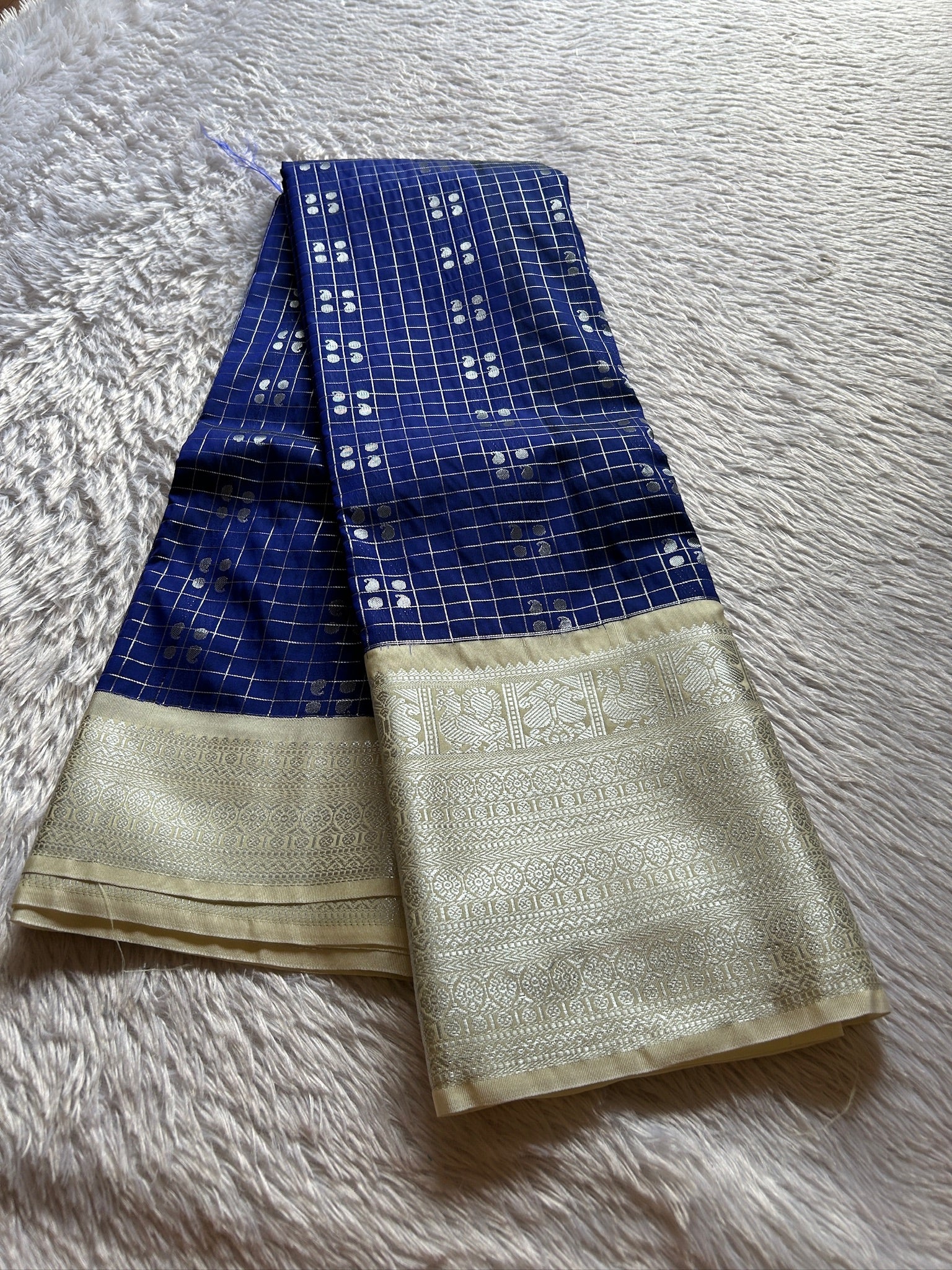 This navy blue semi-soft silk saree features delicate small silver zari checks paired with spaced butta motifs, creating a refined pattern. It is elegantly finished with a beautiful silver zari work pallu and contrasted by an off-white border adorned with intricate silver zari detailing. Perfect for those seeking a subtle yet sophisticated traditional drape with expert craftsmanship.