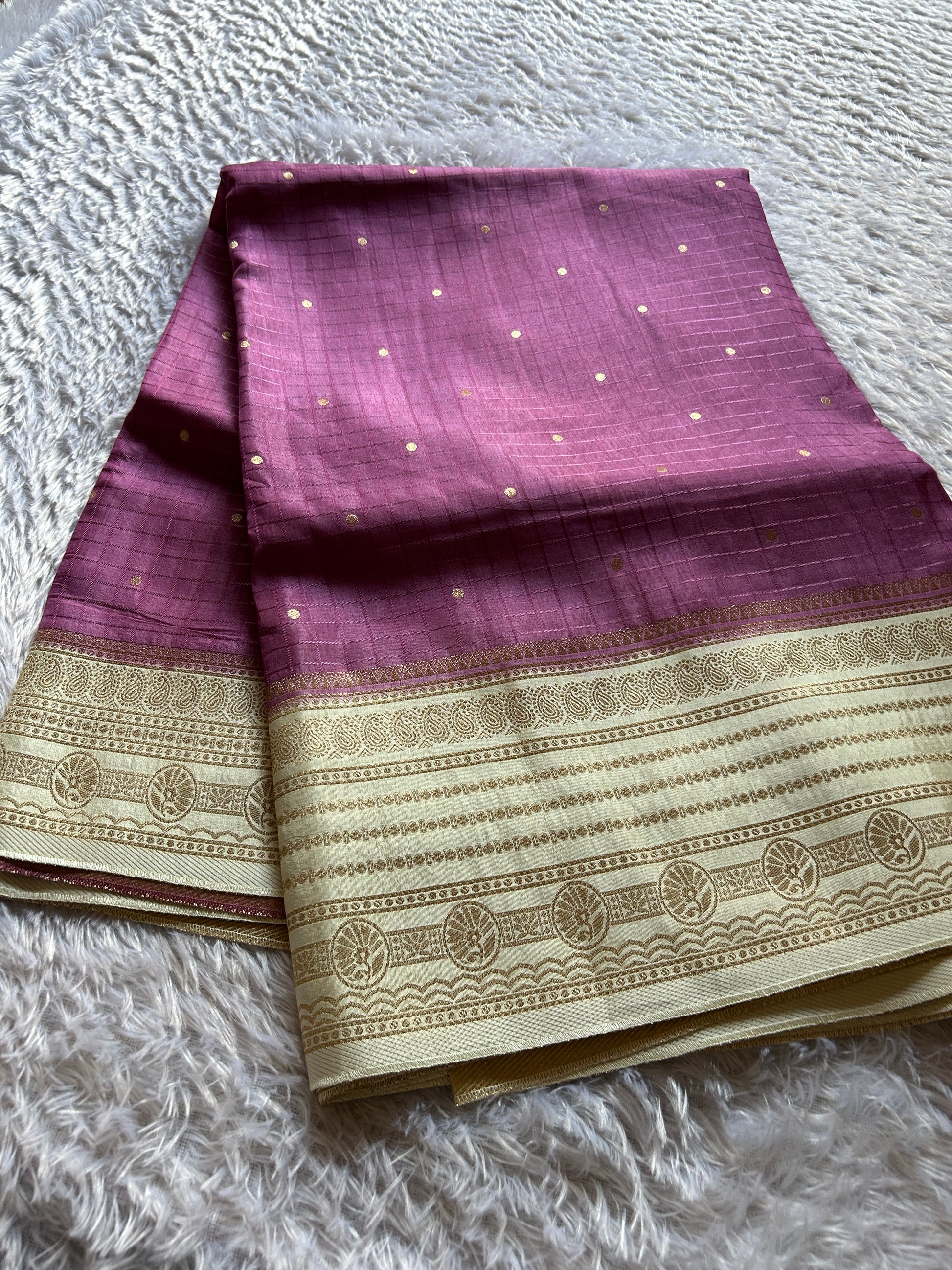 This plum semi-soft silk saree features an elegant checkered texture adorned with delicate small buttas throughout. Its off-white border is intricately designed with zari work showcasing flower and paisley motifs, adding refined charm. The pallu is highlighted by exquisite zari craftsmanship, making this saree a sophisticated choice for special occasions.
