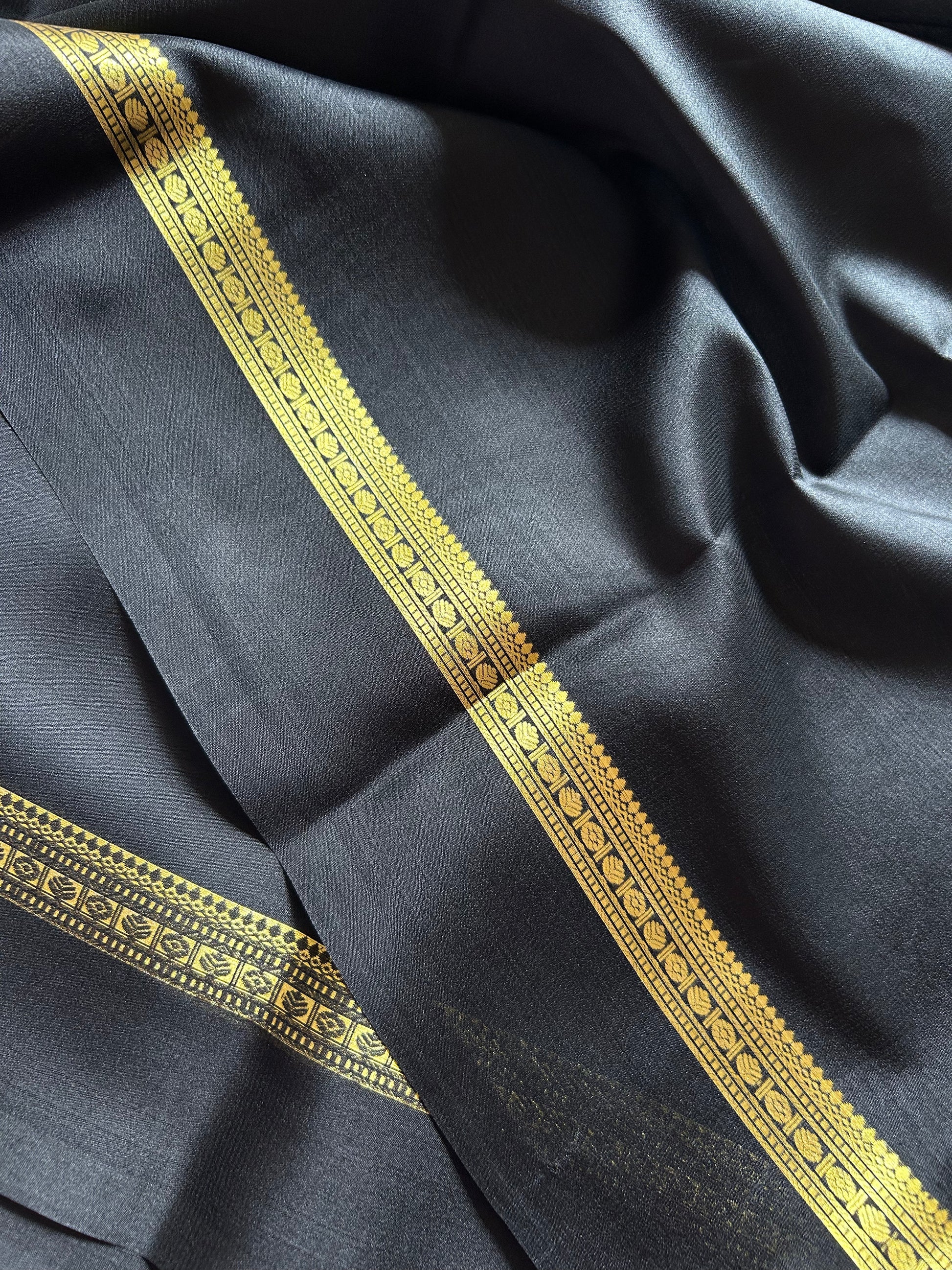 Elevate your ethnic wardrobe with this stunning black Mysore crepe silk saree. Crafted from pure, lightweight silk, it drapes beautifully while remaining comfortable for all-day wear. The saree features a trendy border adorned with intricate zari work, adding a touch of sophistication and sparkle. Perfect for festive occasions, celebrations, or traditional gatherings, this versatile piece seamlessly blends classic elegance with contemporary style. The rich black hue pairs effortlessly with any blouse, making it a timeless addition to your collection.