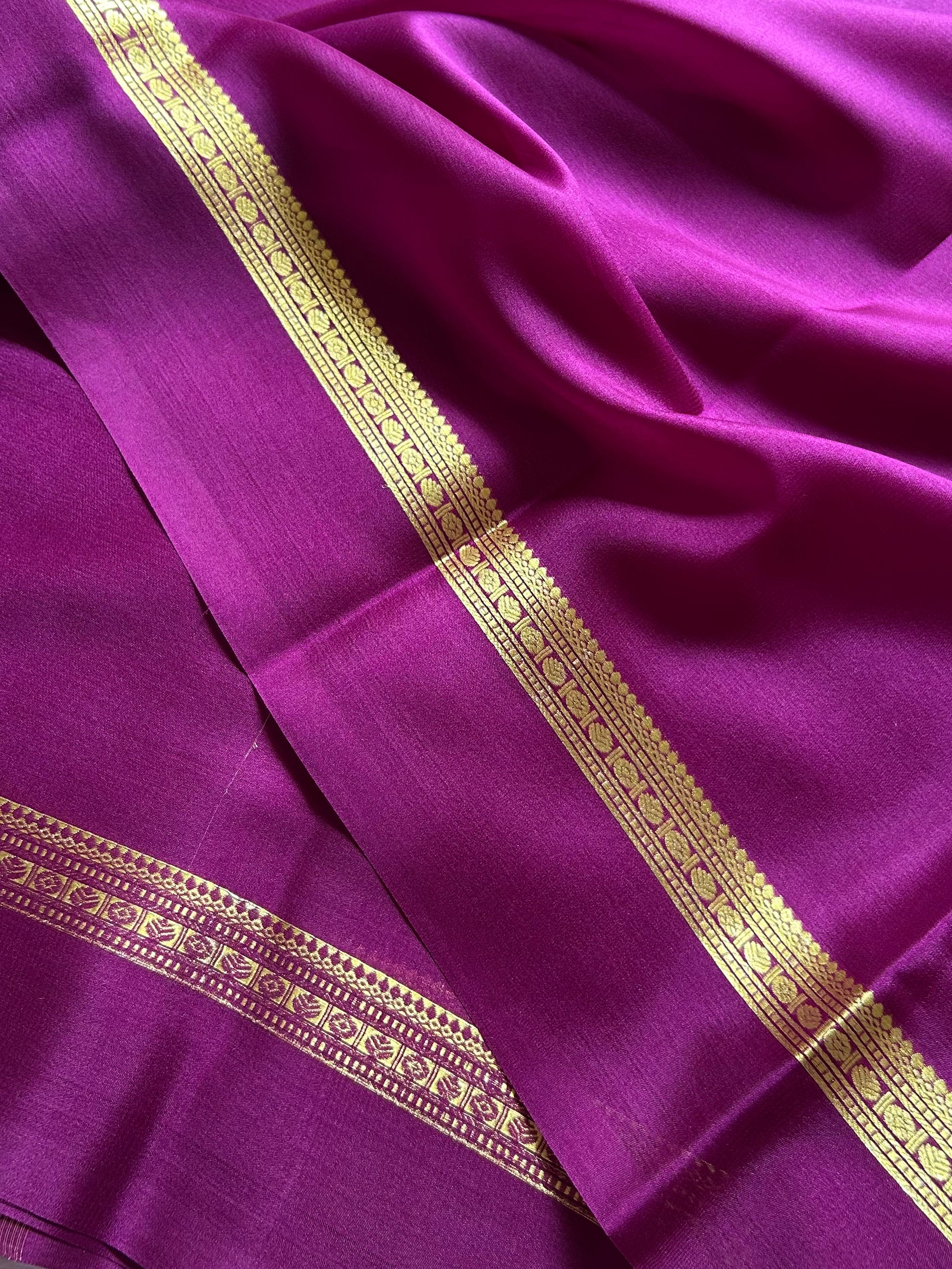 Elevate your ethnic wardrobe with this stunning magenta Mysore crepe silk saree. Crafted from pure silk, this lightweight drape offers effortless elegance and comfort for all-day wear. The saree features a trendy border adorned with intricate zari work, adding a touch of sophistication to the solid magenta base. Perfect for festive occasions, celebrations, or everyday sophistication, this versatile piece seamlessly transitions from traditional to contemporary styling. The fine crepe texture ensures graceful movement while maintaining its shape, making it an essential addition to any saree collection.
