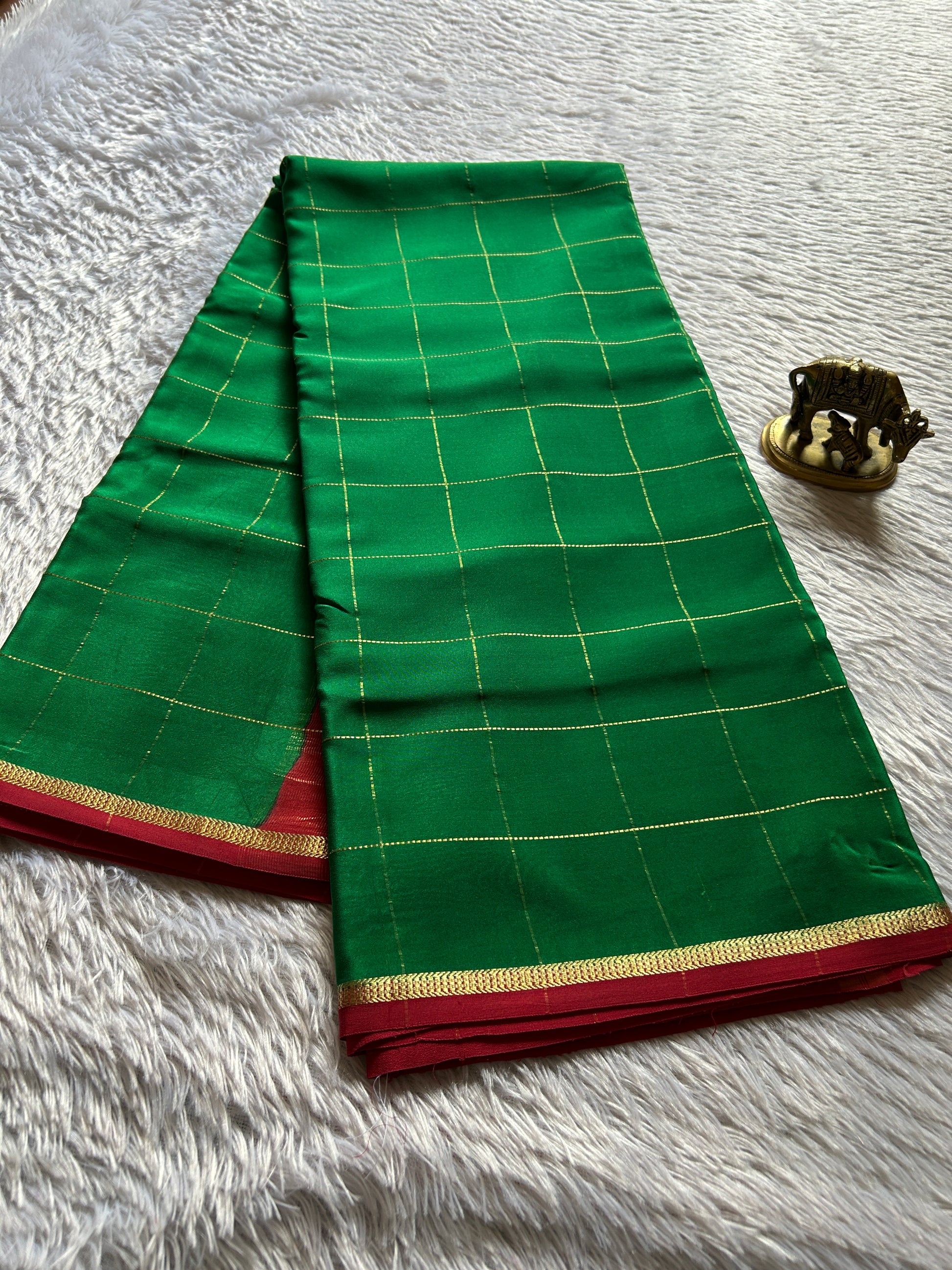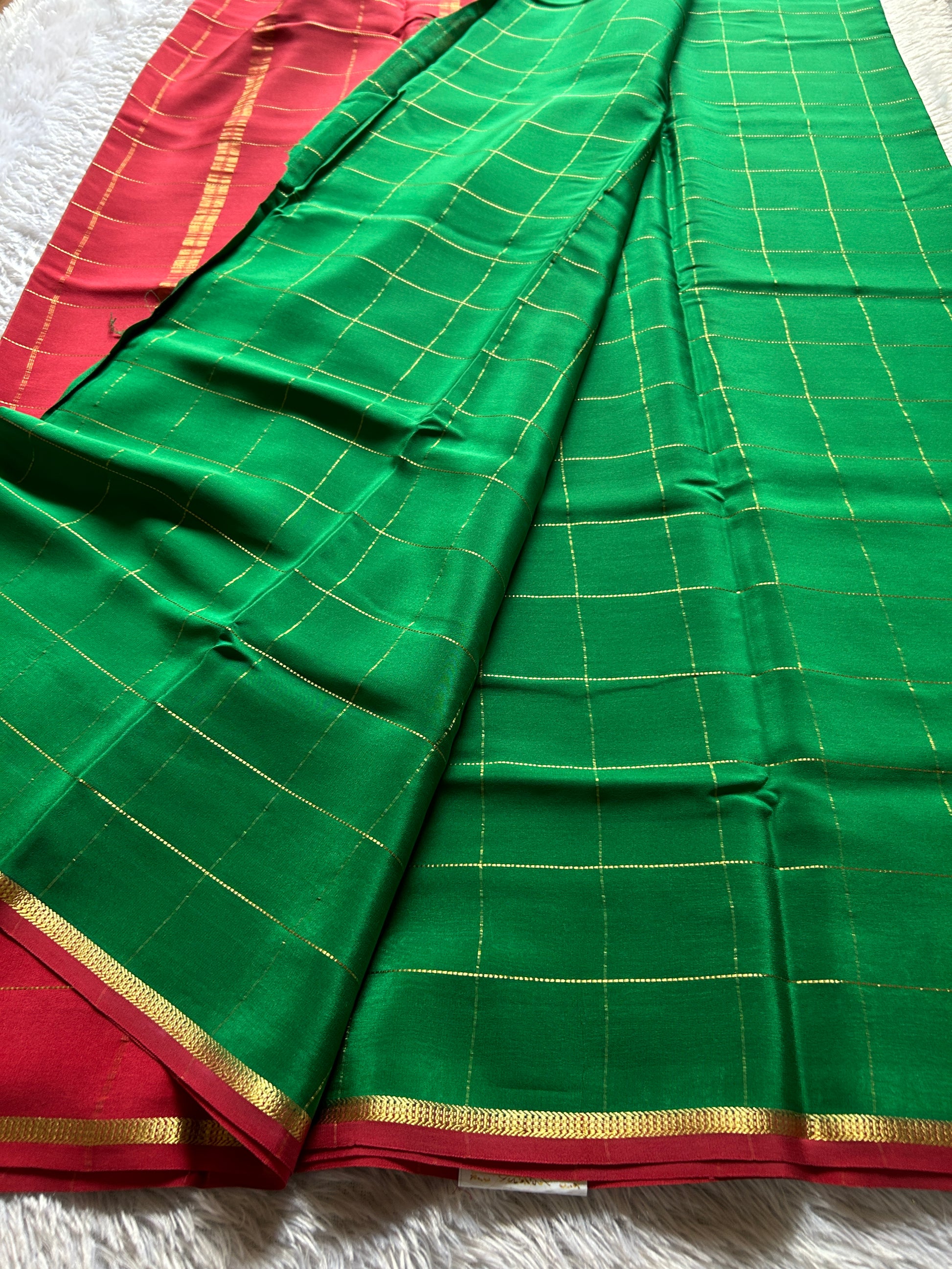 This exquisite emerald green pure Mysore crepe silk saree showcases traditional craftsmanship with large gold zari checks that enhance its rich texture. The contrasting red border and pallu are intricately woven with detailed gold zari work, adding a majestic touch that elevates the overall elegance. Perfect for special occasions, this saree merges timeless heritage with luxurious comfort, reflecting expert weaving techniques synonymous with Mysore silk traditions.