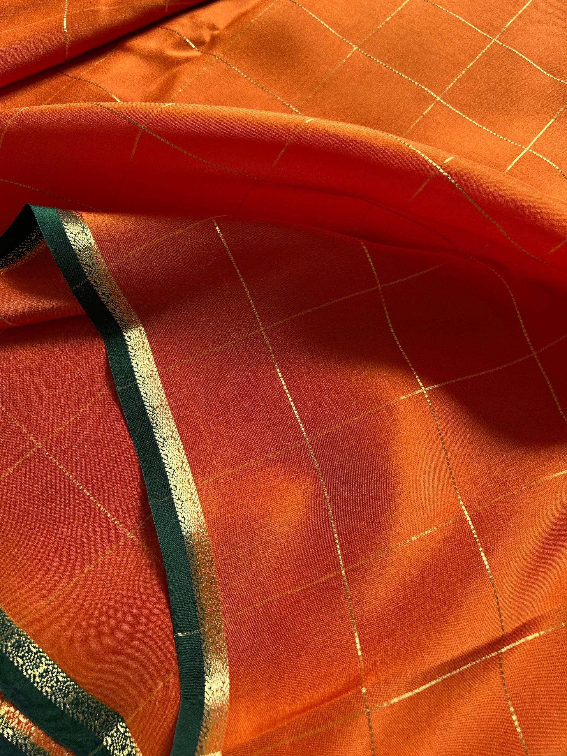 This exquisite orange CSG zari pure Binny crepe silk saree features prominent gold zari checks elegantly spread all over the fabric. It is enhanced by a subtle small gold zari bottle green border and a matching pallu, finely adorned with intricate gold zari craftsmanship. Perfectly balancing traditional artistry and refined elegance, this saree is an ideal choice for discerning connoisseurs seeking timeless beauty and superior silk quality.