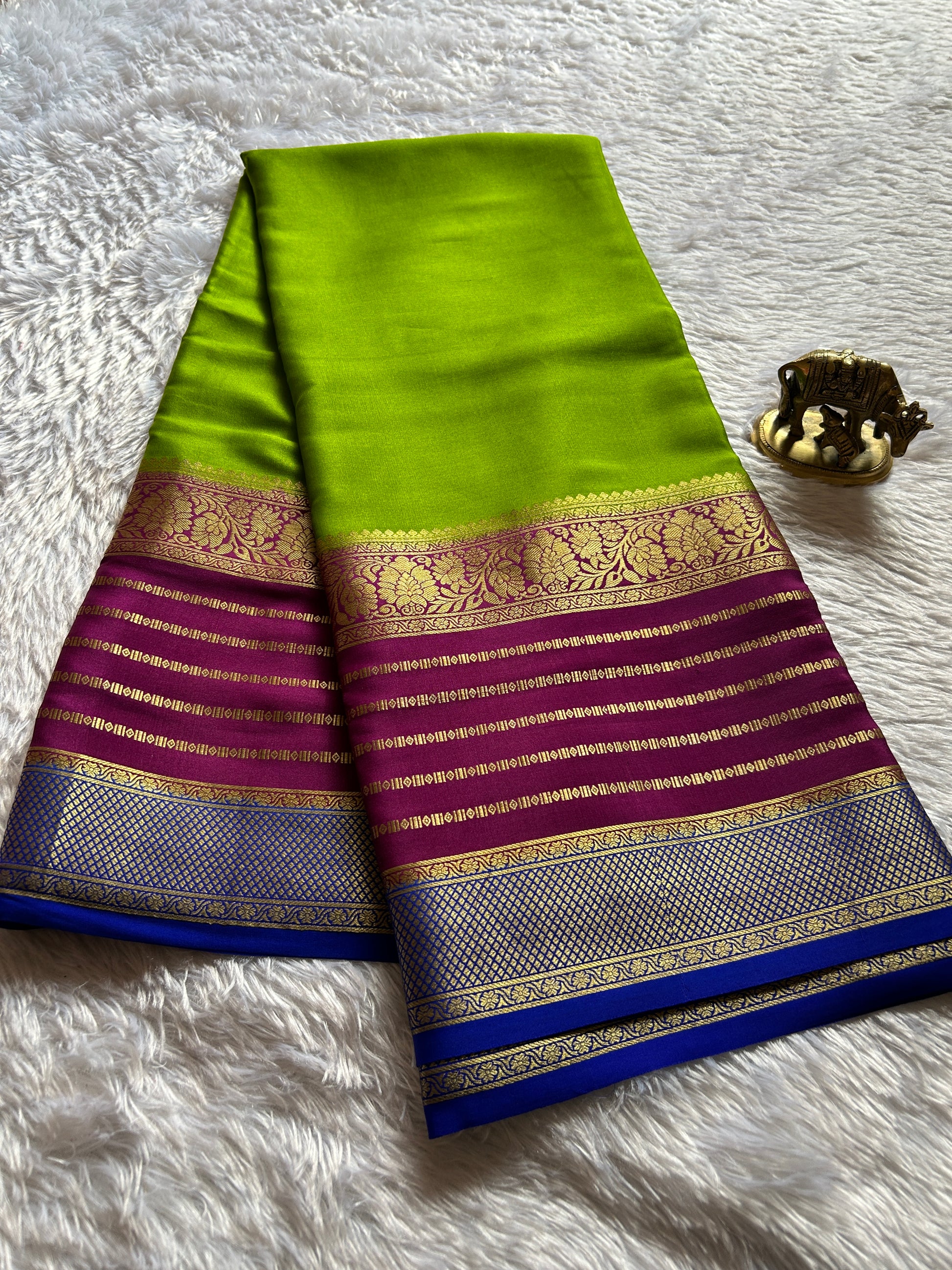 This pure Mysore crepe silk saree features a vibrant mehendi green body with striking magenta and blue borders. Adorned with beautiful zari work that catches the light, this substantial saree offers a rich drape and traditional appeal. The bold color combination makes it perfect for special occasions and cultural celebrations.