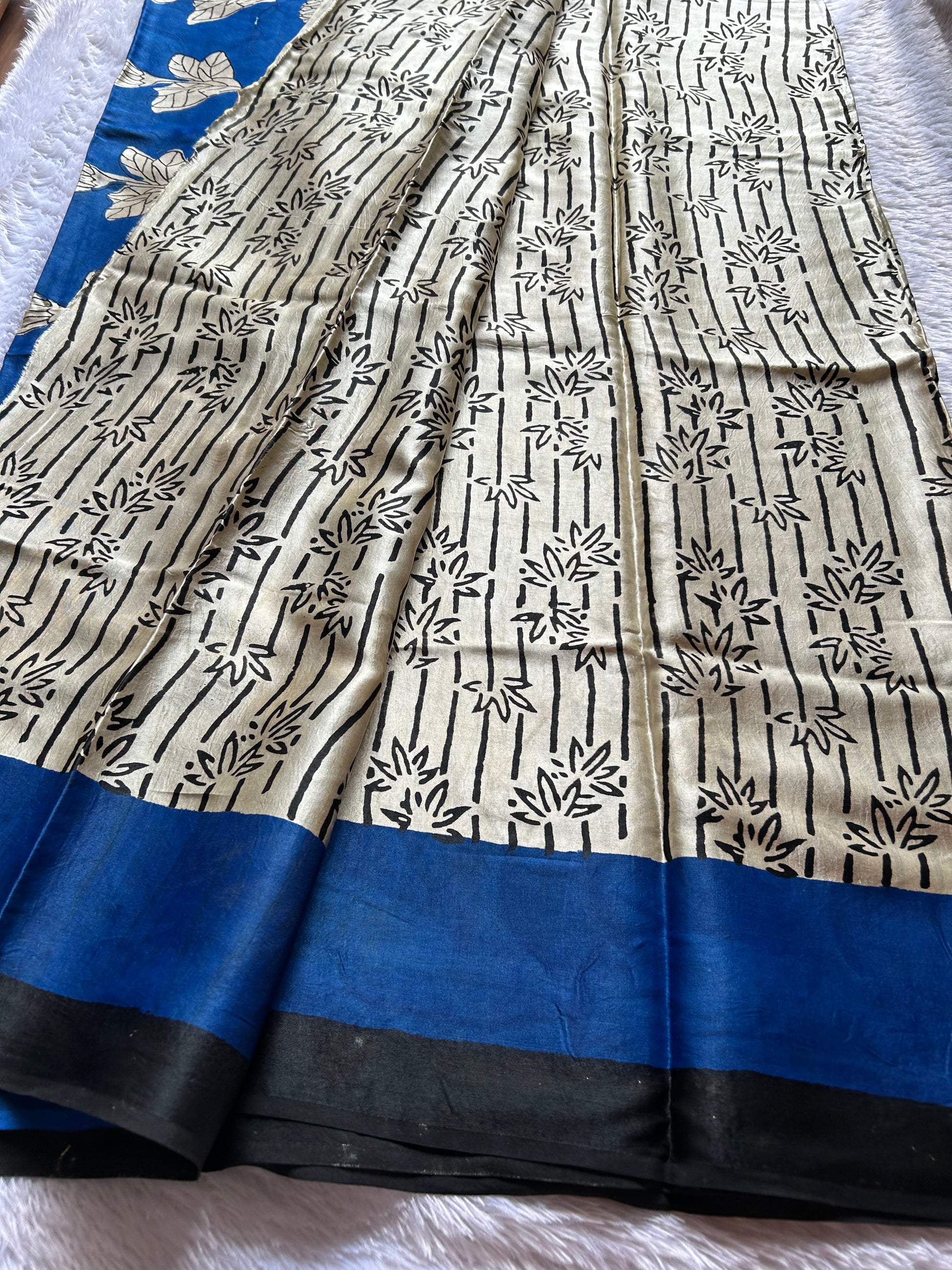 Elevate your everyday elegance with this exquisite soft modal silk saree, featuring a sophisticated off-white base adorned with intricate black floral patterns throughout. The design is anchored by a striking dark blue and black border that adds depth and definition to the drape and dark blue printed pallu. Crafted from premium modal silk, this saree offers unparalleled softness and a graceful flow that moves beautifully with you. The accompanying printed blouse material perfectly complements the saree's aesthetic, allowing you to create a cohesive, polished look. Ideal for both casual gatherings and semi-formal occasions, this piece combines traditional craftsmanship with contemporary comfort.