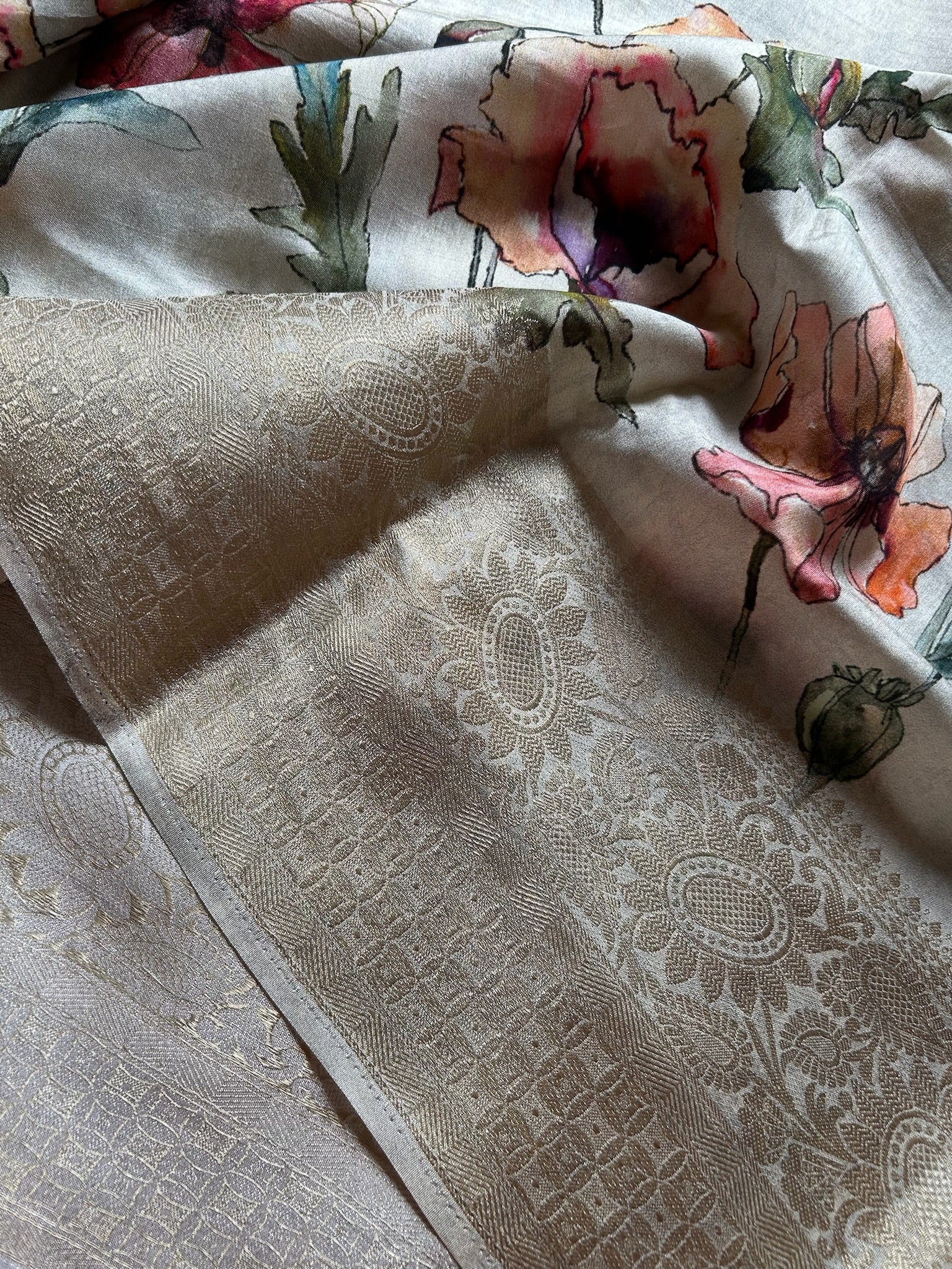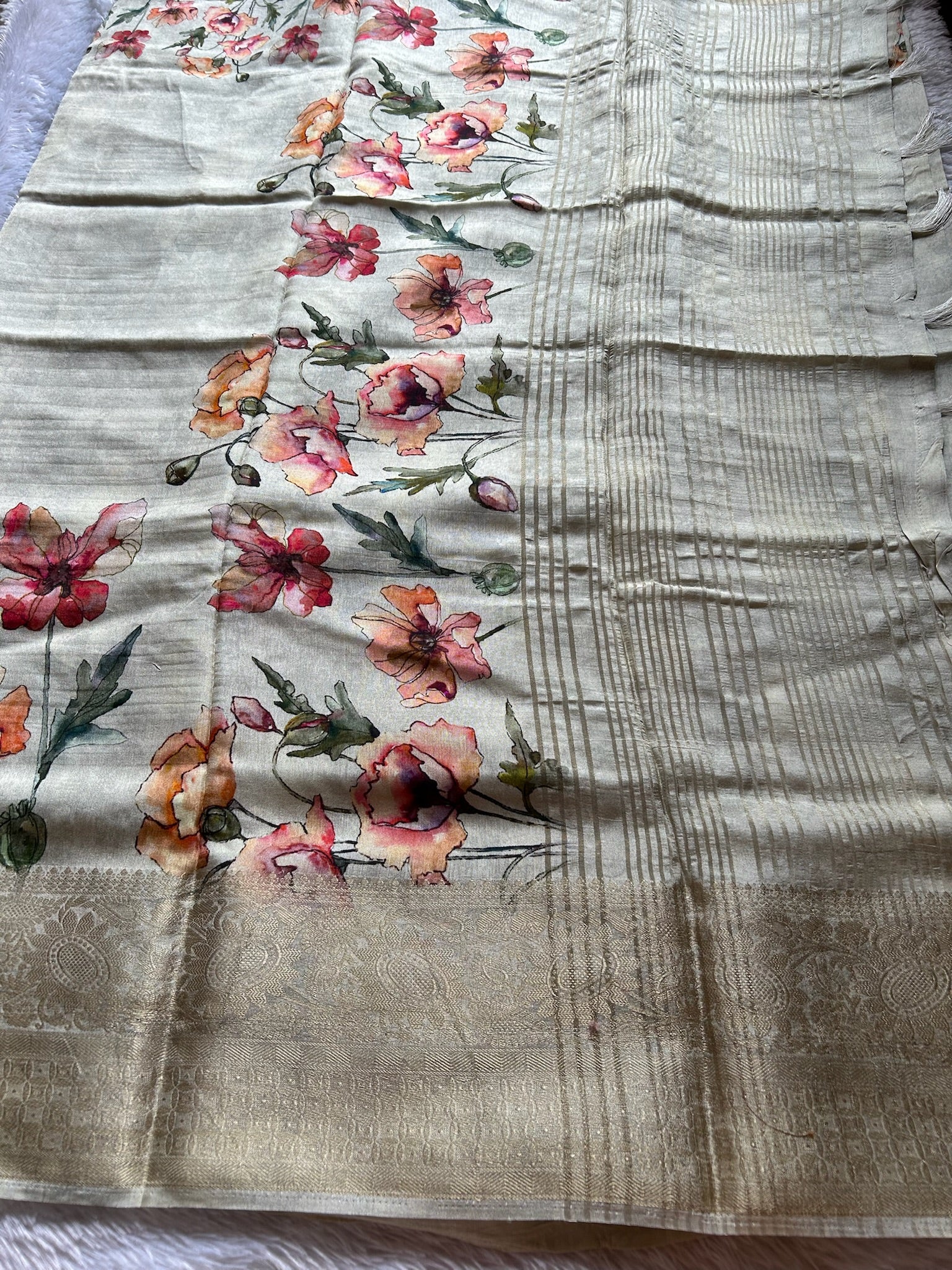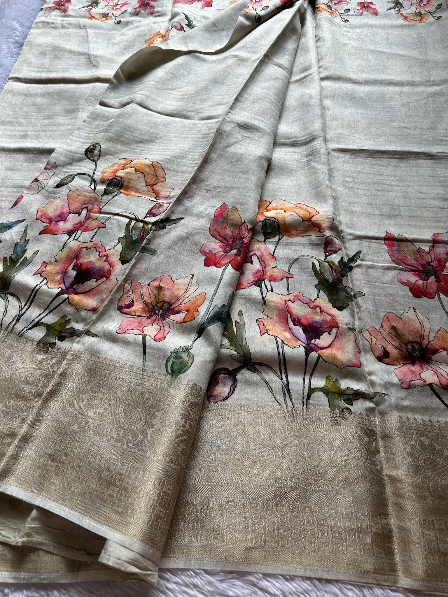 Elevate your ethnic wardrobe with this exquisite off-white soft modal silk saree, featuring an enchanting peach and red floral print that cascades across the entire fabric. The luxurious drape of modal silk ensures comfort throughout the day, while the rich zari border adds a touch of opulence and traditional craftsmanship. Perfect for festive occasions, celebrations, or refined everyday wear, this saree seamlessly blends contemporary softness with timeless elegance. The harmonious color palette of off-white, peach, and red creates a sophisticated aesthetic that complements various skin tones and styling preferences.