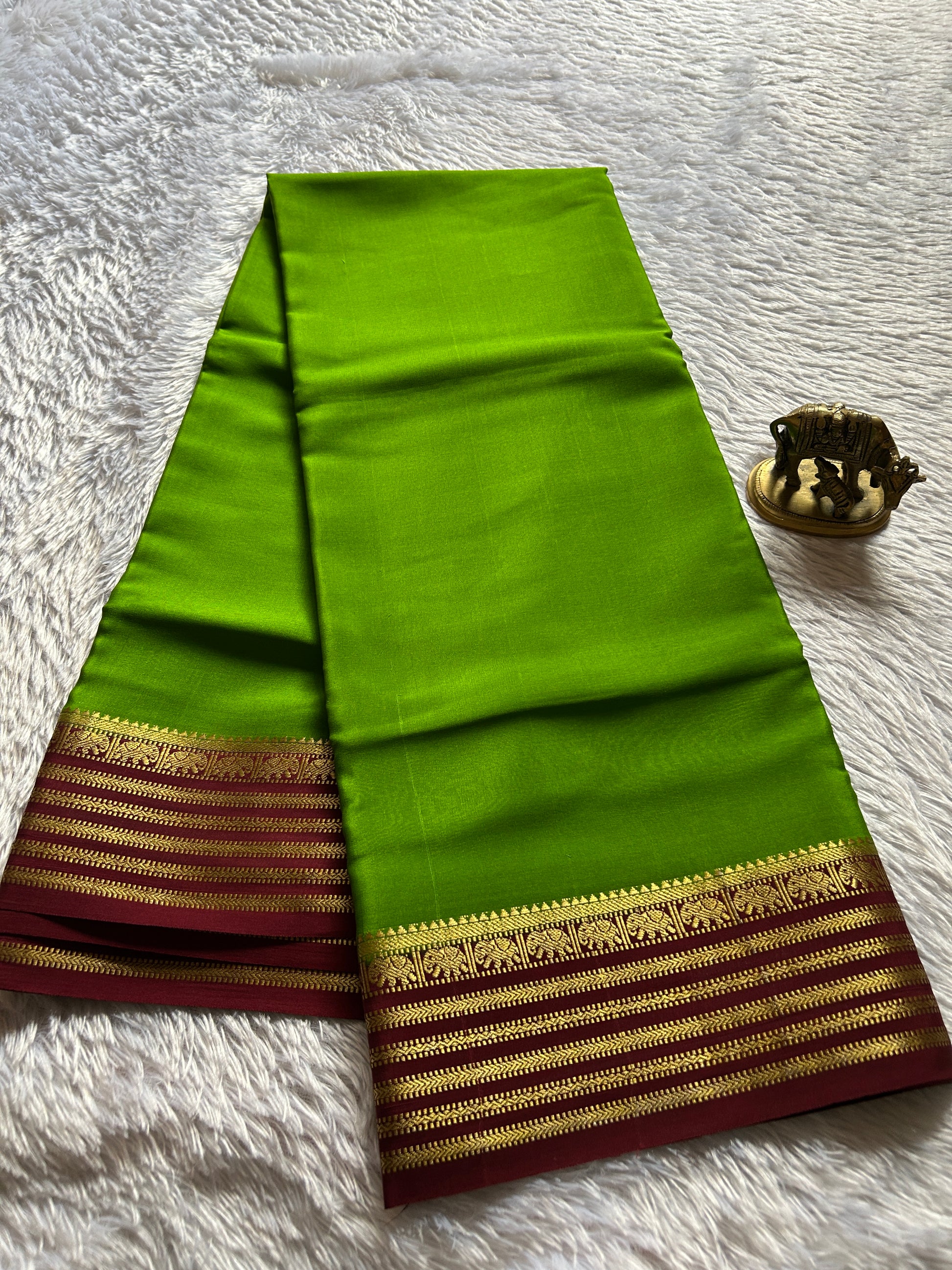 This mehendi green pure Mysore crepe silk saree features a striking maroon border with intricate zari lines. Crafted with expert precision, this saree exudes elegance and sophistication. Made with the finest materials, this saree is perfect for any formal occasion.