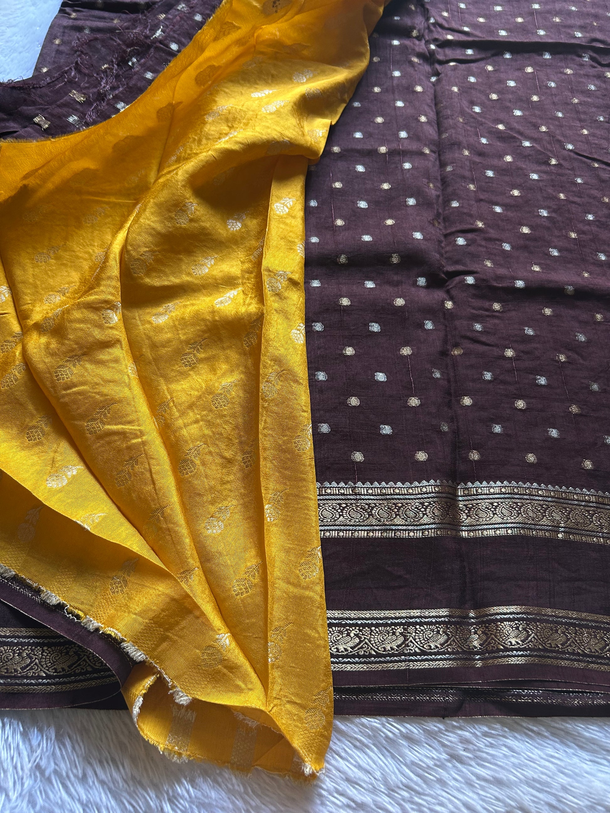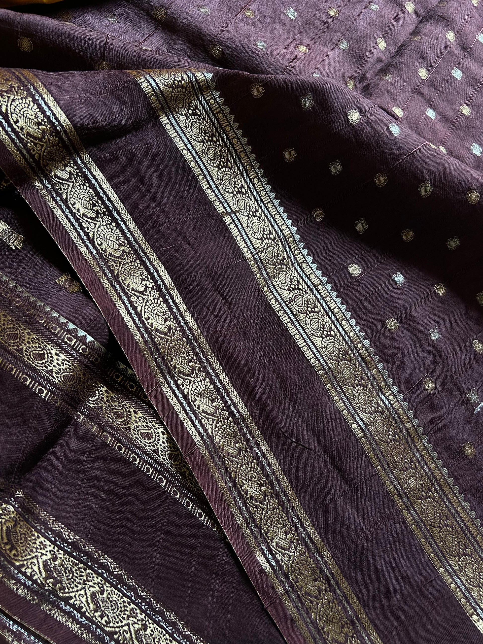 Elevate your ethnic wardrobe with this sophisticated Chocolate brown saree crafted from premium semi-crepe silk. The fabric features delicate zari buttas scattered throughout, creating an understated yet elegant aesthetic. A distinctive gap border adorned with intricate zari work frames the pallu beautifully, adding dimension without overwhelming the design. The accompanying violet blouse piece, embellished with matching zari buttas, complements the saree perfectly and offers versatile styling options. Ideal for festive occasions, celebrations, or refined everyday wear, this piece exemplifies timeless saree craftsmanship with its balanced blend of solid elegance and detailed embellishment.