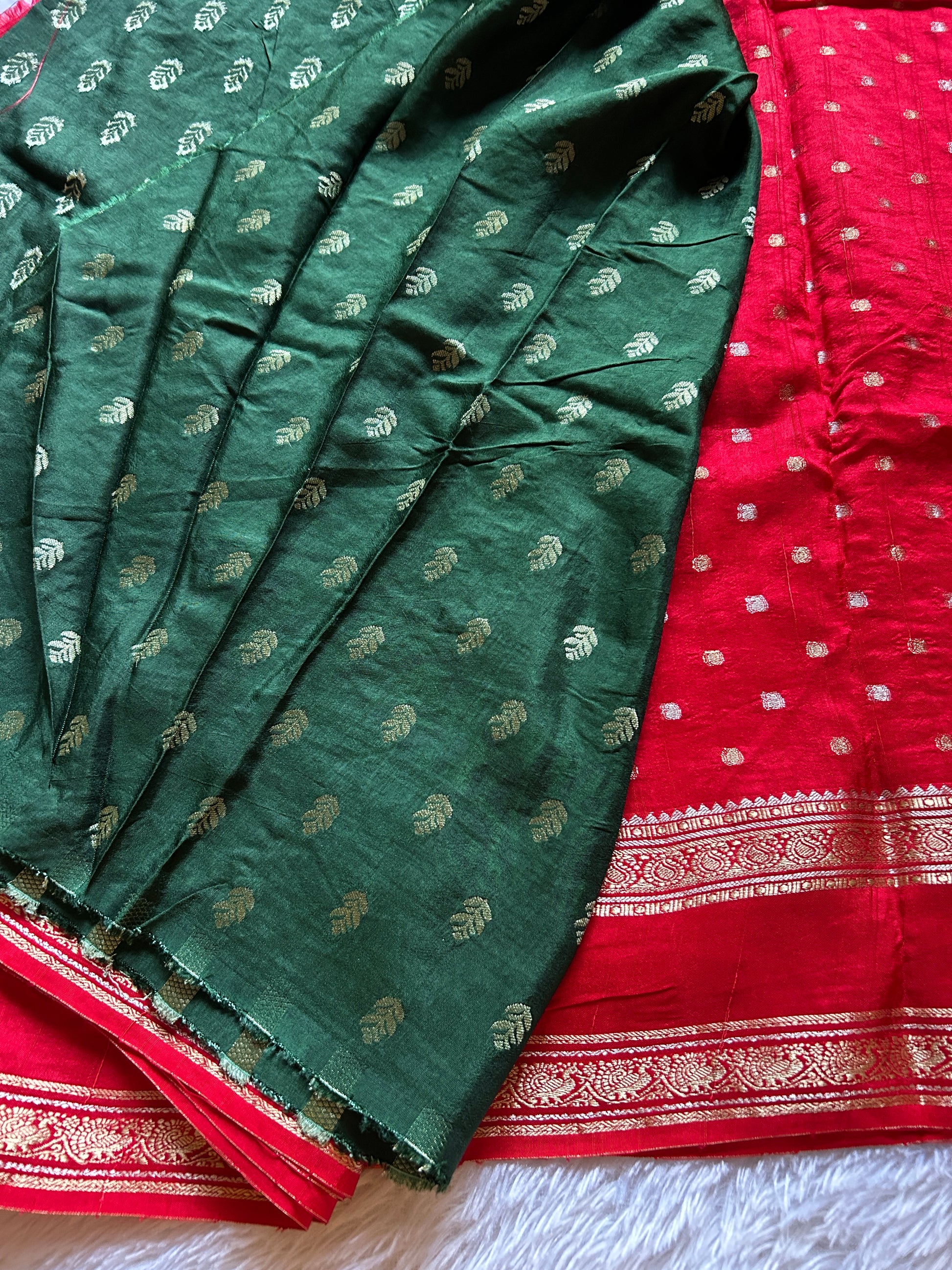 Elevate your ethnic wardrobe with this striking red semi-crepe silk saree, meticulously crafted for the discerning wearer. The fabric showcases delicate zari buttas scattered throughout, creating an understated yet sophisticated allover pattern. A distinctive gap border enriched with intricate zari work frames the pallu beautifully, adding architectural elegance to your drape. Complementing the ensemble is a dark green blouse piece adorned with matching zari buttas, offering versatile styling options. The semi-crepe texture provides a refined drape while maintaining structural integrity, making this piece ideal for both festive occasions and refined celebrations. A timeless investment in traditional craftsmanship.