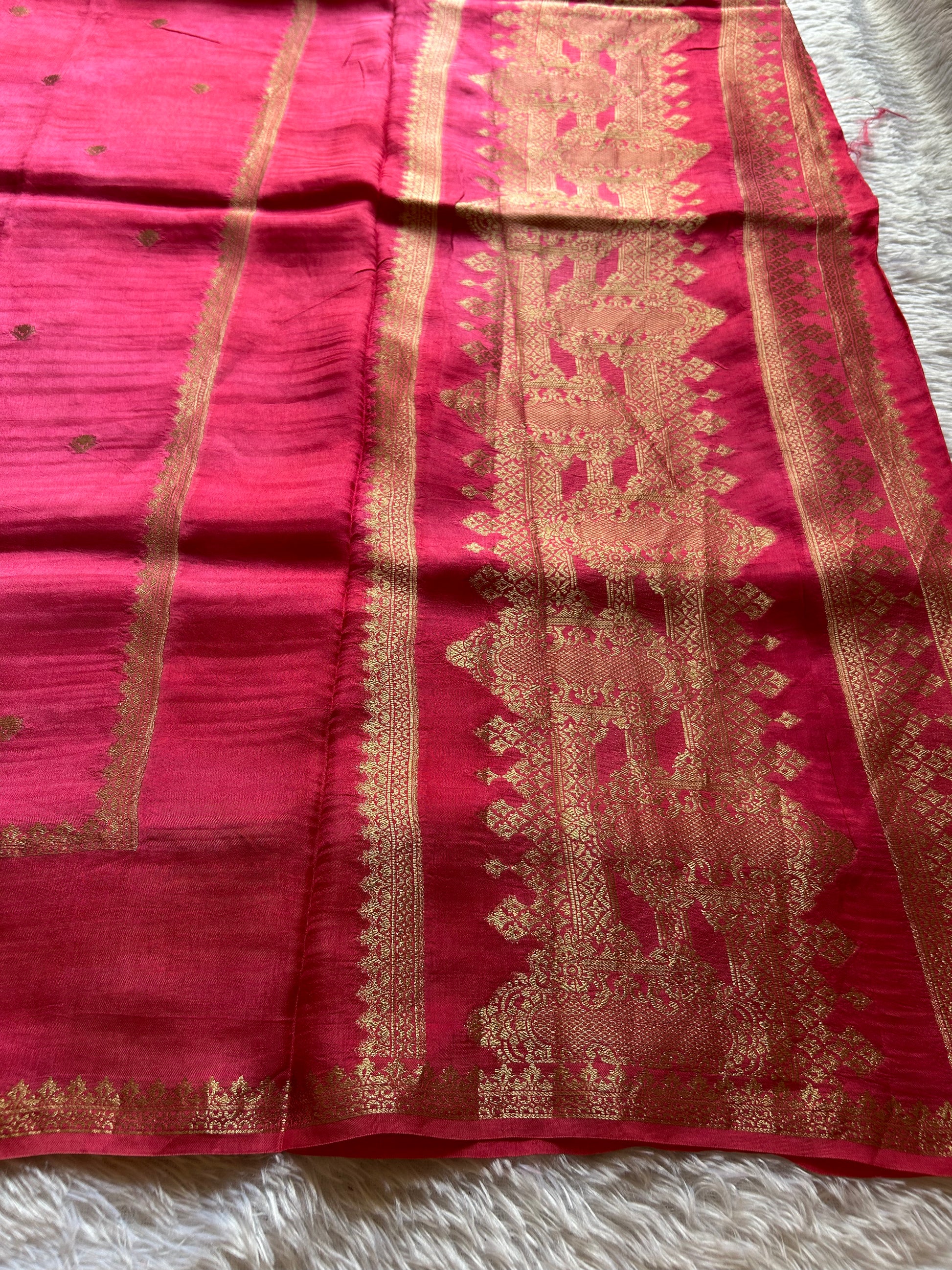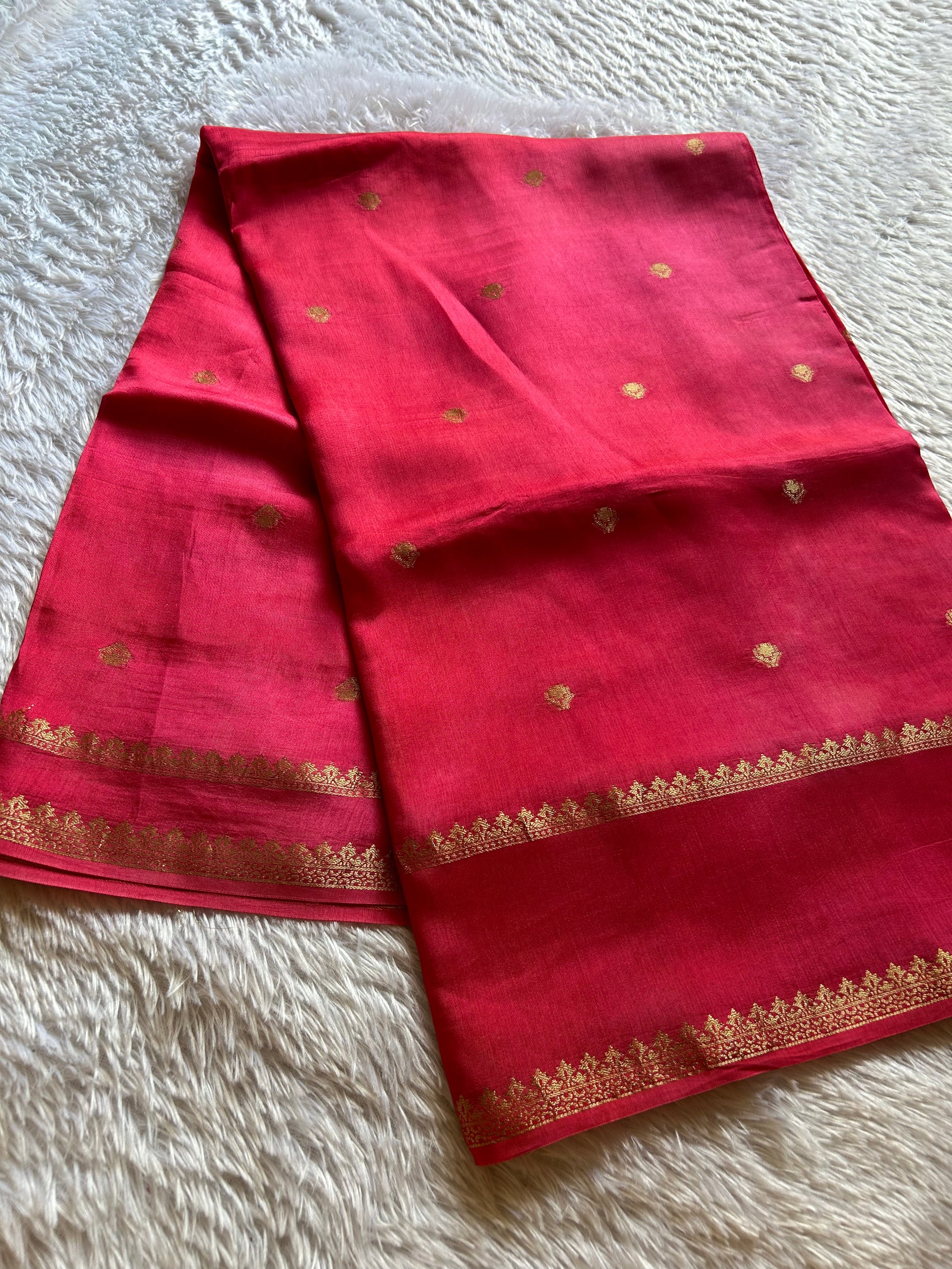 Elevate your ethnic wardrobe with this striking hot pink semi crepe silk saree, a masterpiece of traditional craftsmanship. Delicate buttas are artfully scattered across the fabric, creating an understated yet sophisticated visual rhythm. The saree features an elegant gap border adorned with intricate zari work that frames the pallu beautifully. Complemented by a coordinating red blouse piece embellished with zari buttas, this ensemble offers a harmonious blend of contrasting hues and complementary embellishments. Perfect for festive occasions, celebrations, or when you seek to make a refined statement with timeless elegance.