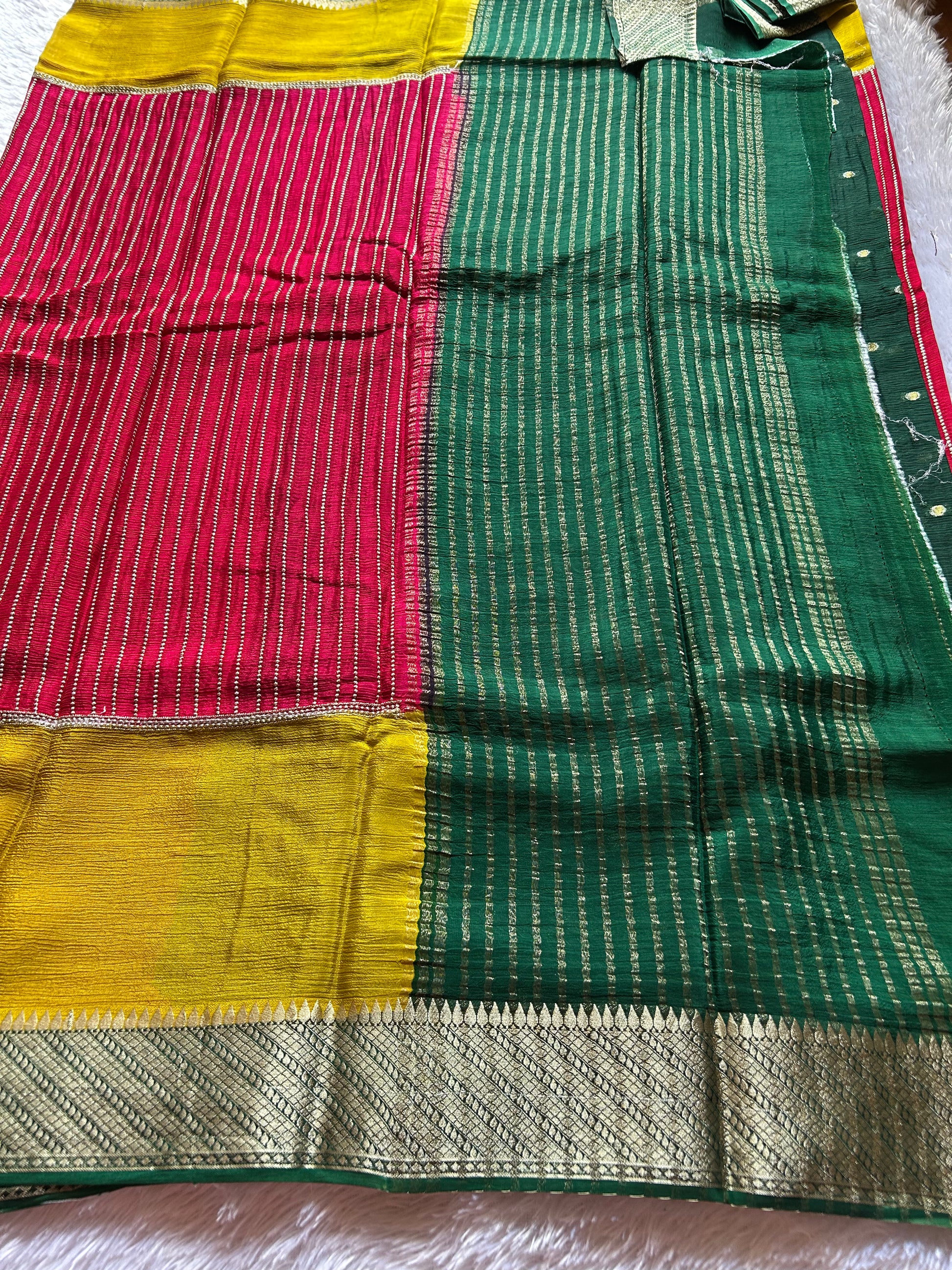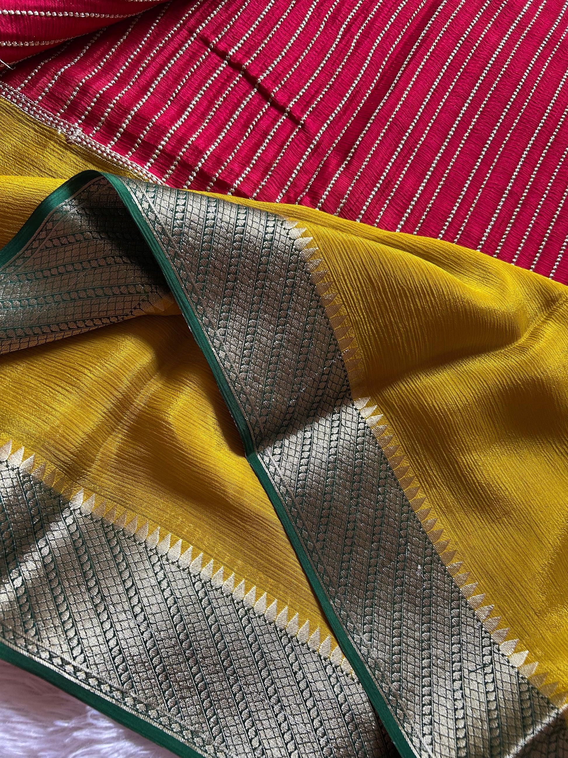 Elevate your ethnic wardrobe with this stunning red chiffon saree, a masterpiece of traditional craftsmanship. Delicate vertical zari lines cascade across the fabric, creating an intricate all-over pattern that catches light beautifully. The borders showcase a sophisticated palette of olive and dark green, adorned with classic zari embroidery that speaks to timeless elegance. The matching dark green pallu features elaborate zari work, while the coordinated blouse piece completes the ensemble with the same refined detailing. Crafted from soft, breathable chiffon, this saree offers both comfort and grace, making it an ideal choice for festive occasions and celebrations.