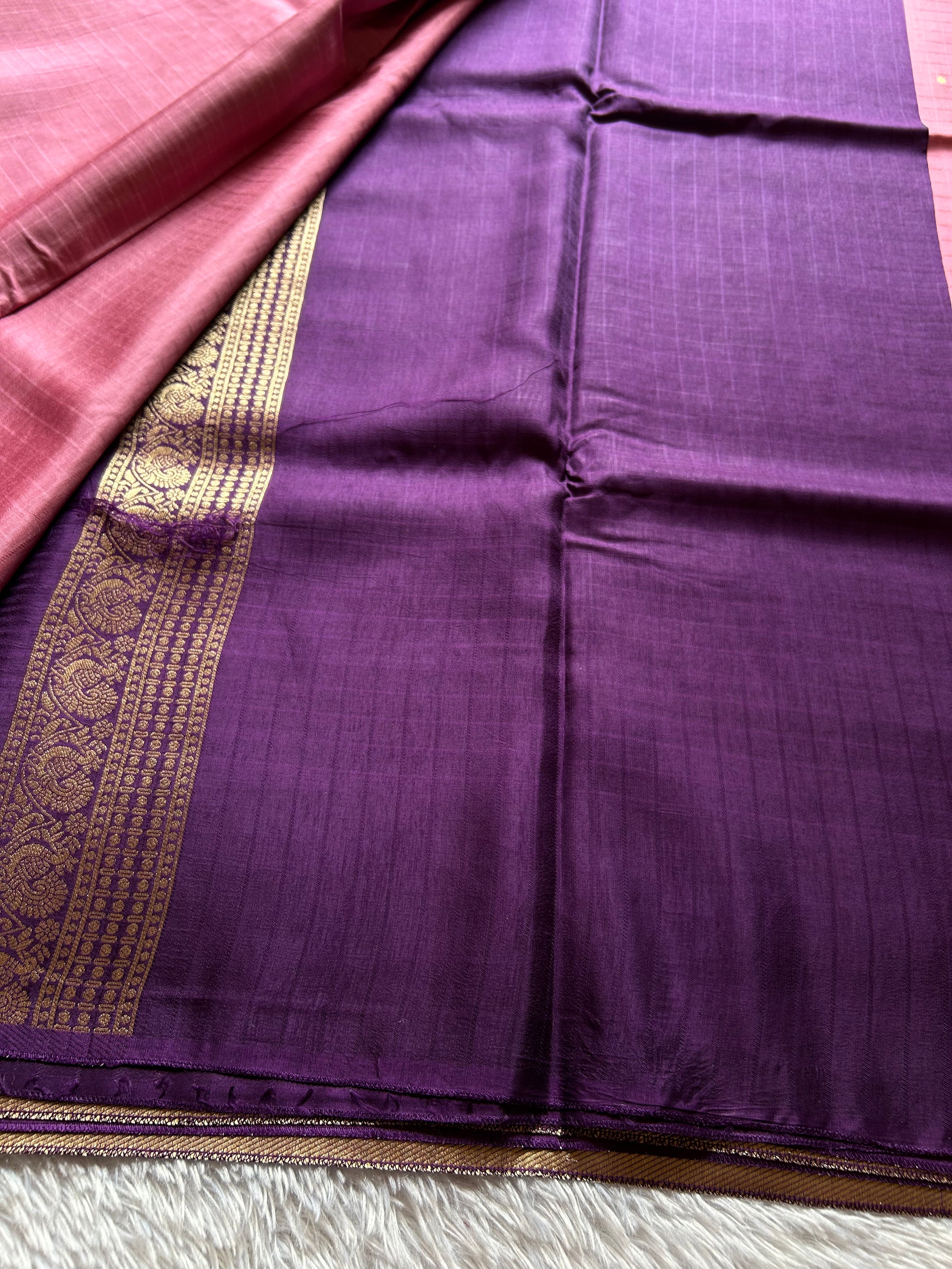 Drape yourself in timeless elegance with this baby pink semi-soft silk saree. The fabric features a refined checkered texture complemented by delicate buttas scattered throughout. A striking purple border showcases intricate zari work with traditional peacock and paisley motifs, while the ornate pallu displays exquisite zari craftsmanship. Perfect for weddings, festivals, and special occasions, this saree seamlessly blends contemporary softness with classic artisanal detailing.