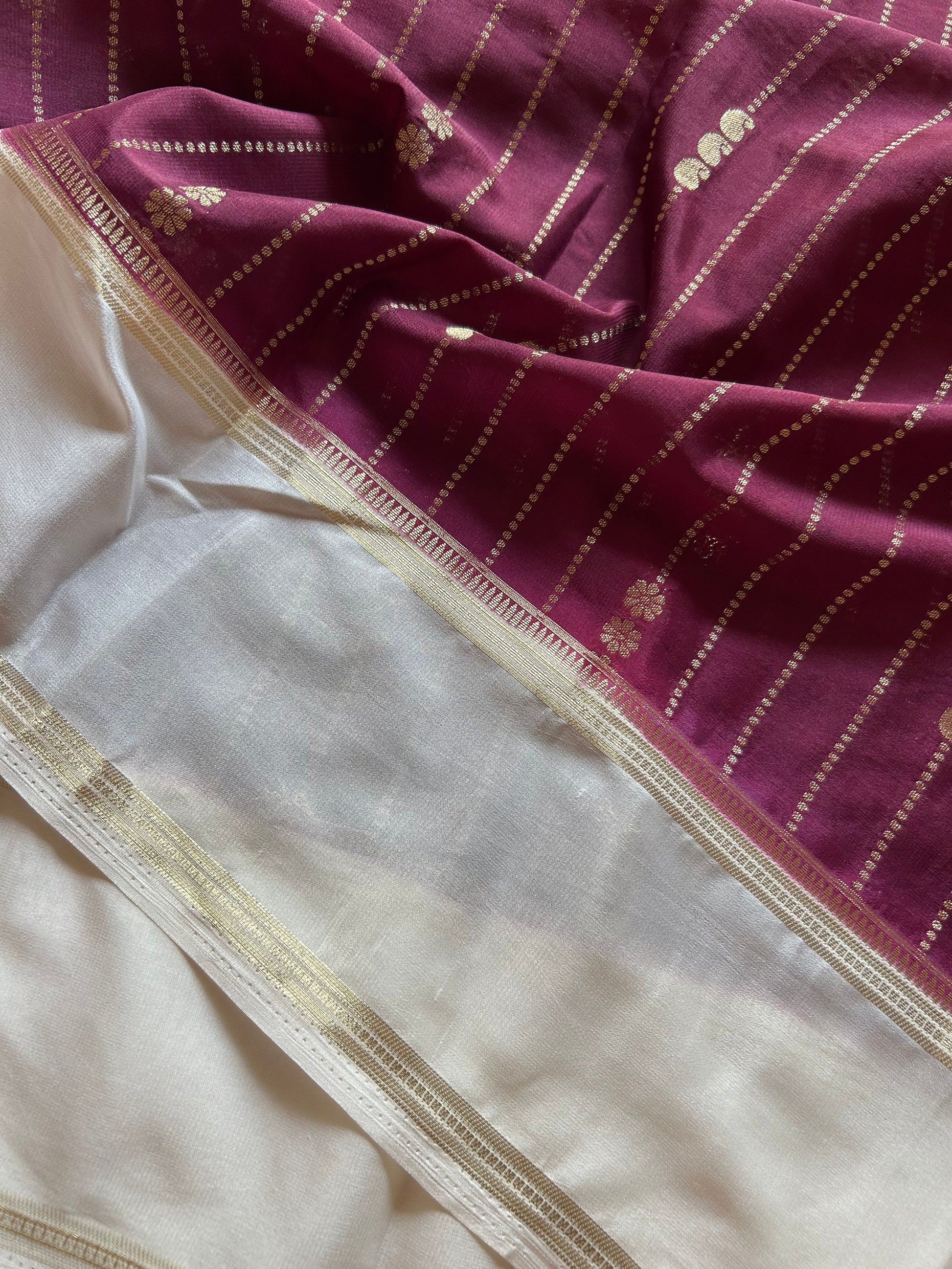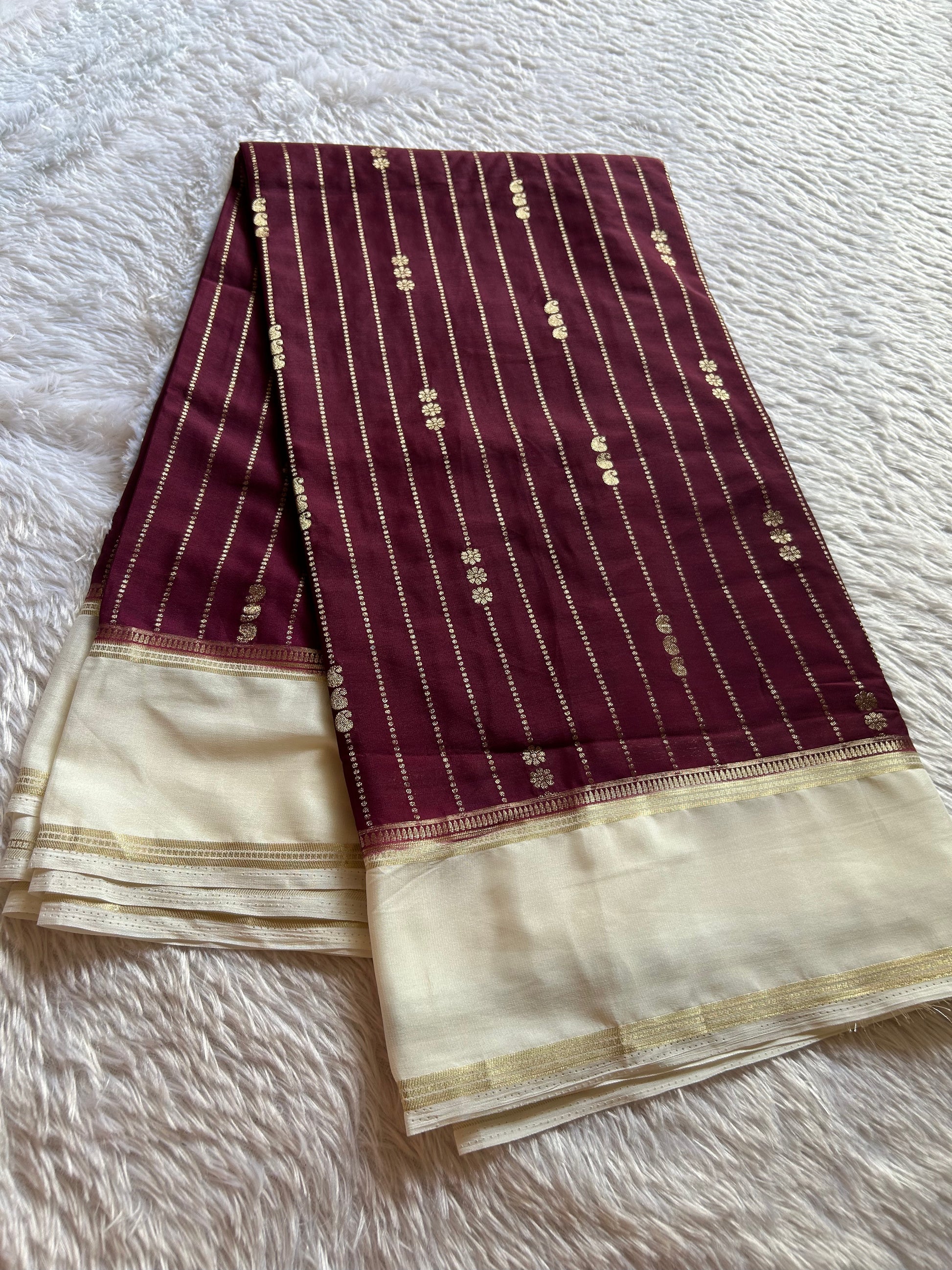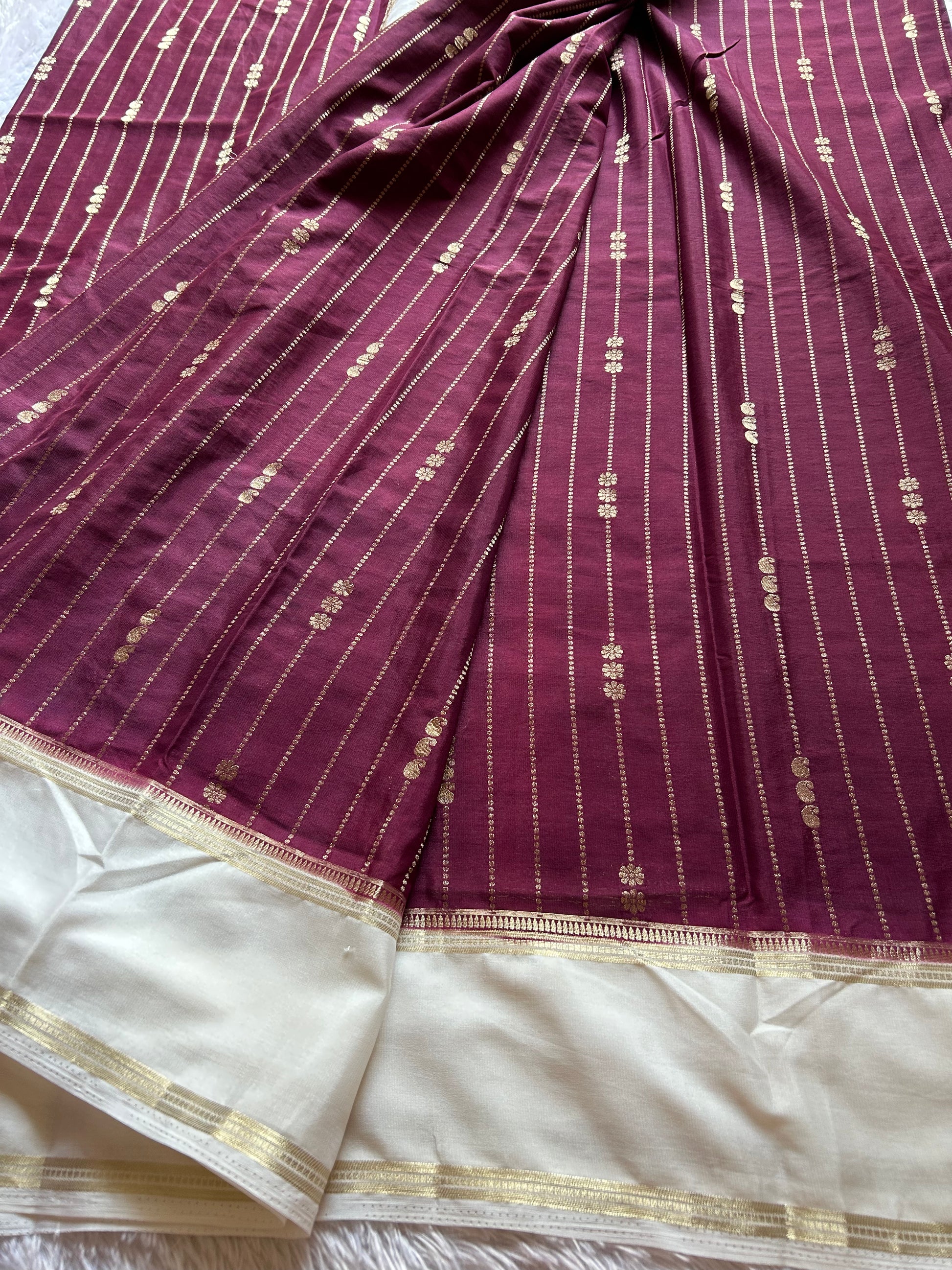Elevate your ethnic wardrobe with this sophisticated wine semi crepe silk saree, a masterpiece of refined craftsmanship. Delicate vertical zari lines traverse the entire fabric, creating an intricate geometric pattern that catches light beautifully. The off-white gap border provides striking contrast, while the pallu showcases exquisite zari embellishment that commands attention. Crafted from premium semi crepe silk, this saree drapes with graceful fluidity, making it an ideal choice for festive occasions, celebrations, and formal gatherings. The harmonious color palette and meticulous detailing reflect timeless elegance and contemporary sensibility.