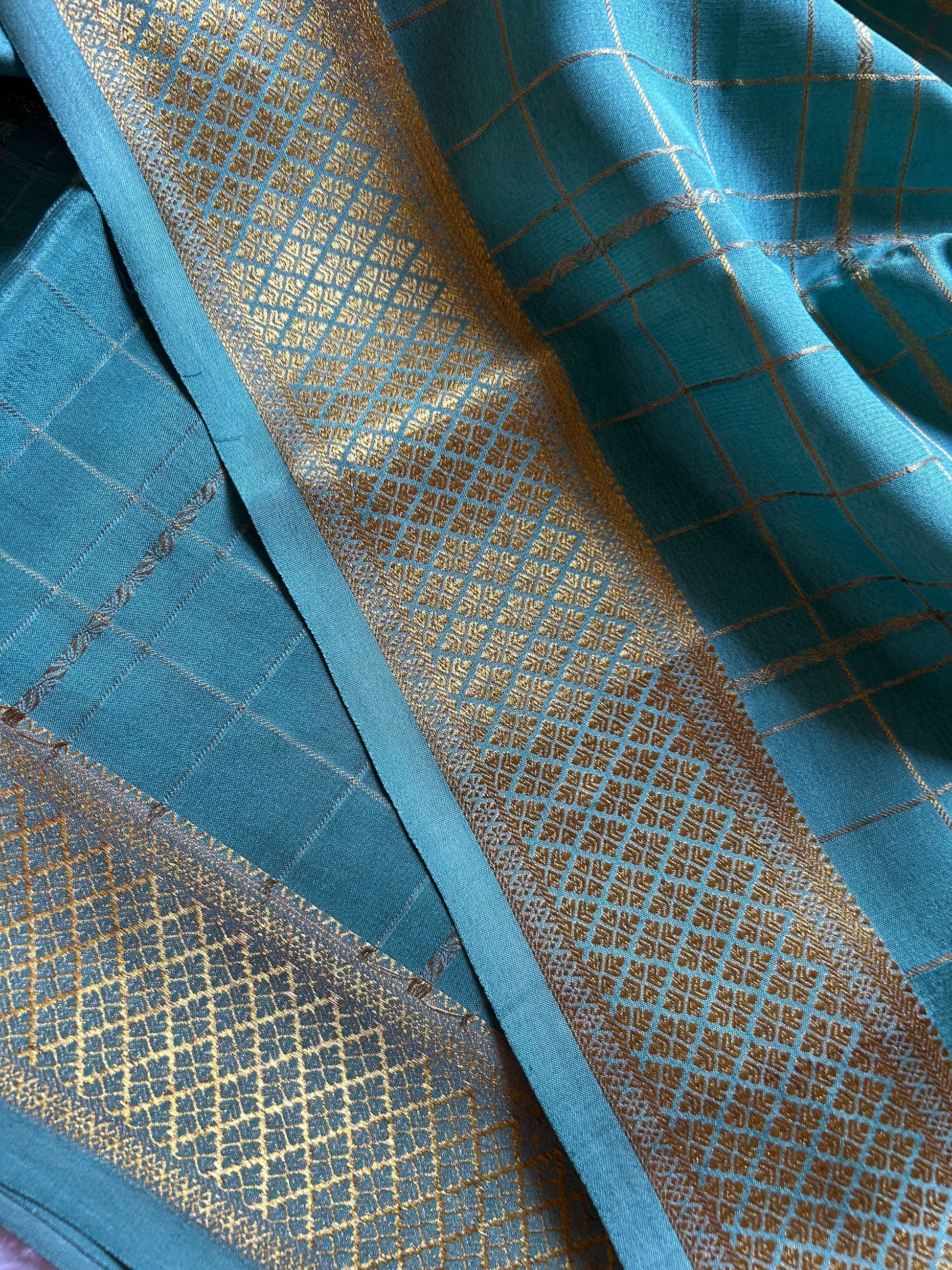 Elevate your ethnic wardrobe with this stunning sky blue Mysore crepe silk saree. Crafted from pure silk, this piece features delicate zari checks scattered throughout, creating an understated yet sophisticated pattern. The saree showcases a rich, intricately embellished border and pallu adorned with detailed zari work that catches light beautifully. Perfect for festive occasions, weddings, or traditional celebrations, this saree combines timeless elegance with refined craftsmanship. The luxurious crepe texture drapes gracefully, ensuring comfort and style with every wear.