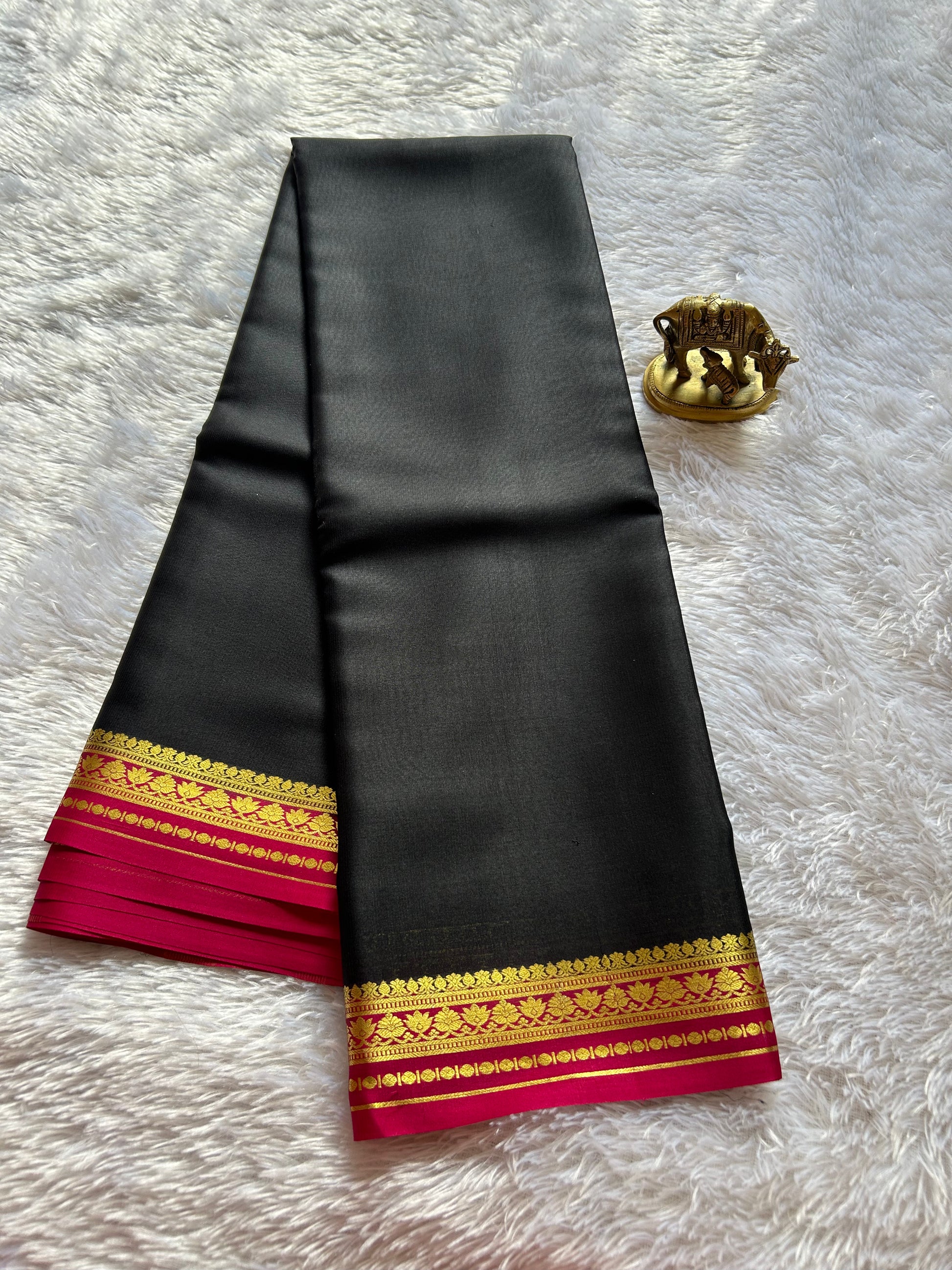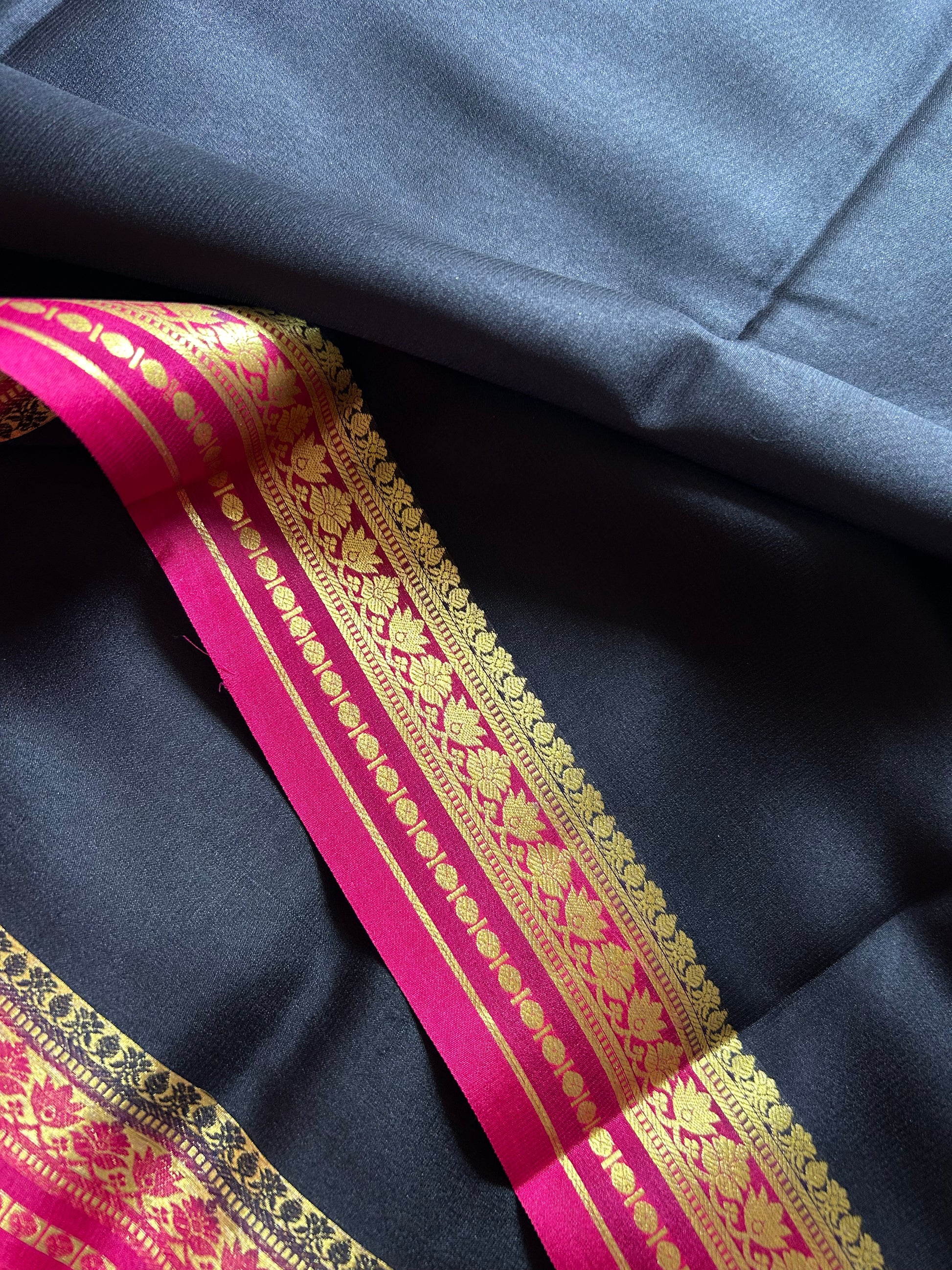 Elevate your collection with this exquisite black Mysore crepe silk saree, crafted from pure silk at a luxurious 60 GSM weight. The lightweight fabric drapes beautifully while maintaining its structural integrity, making it ideal for all-day wear. A striking pink border adorned with intricate zari work adds sophisticated elegance and traditional craftsmanship. The delicate embellishment showcases meticulous detailing that complements both formal occasions and refined everyday styling. Perfect for those who appreciate authentic silk sarees with timeless appeal and superior quality.