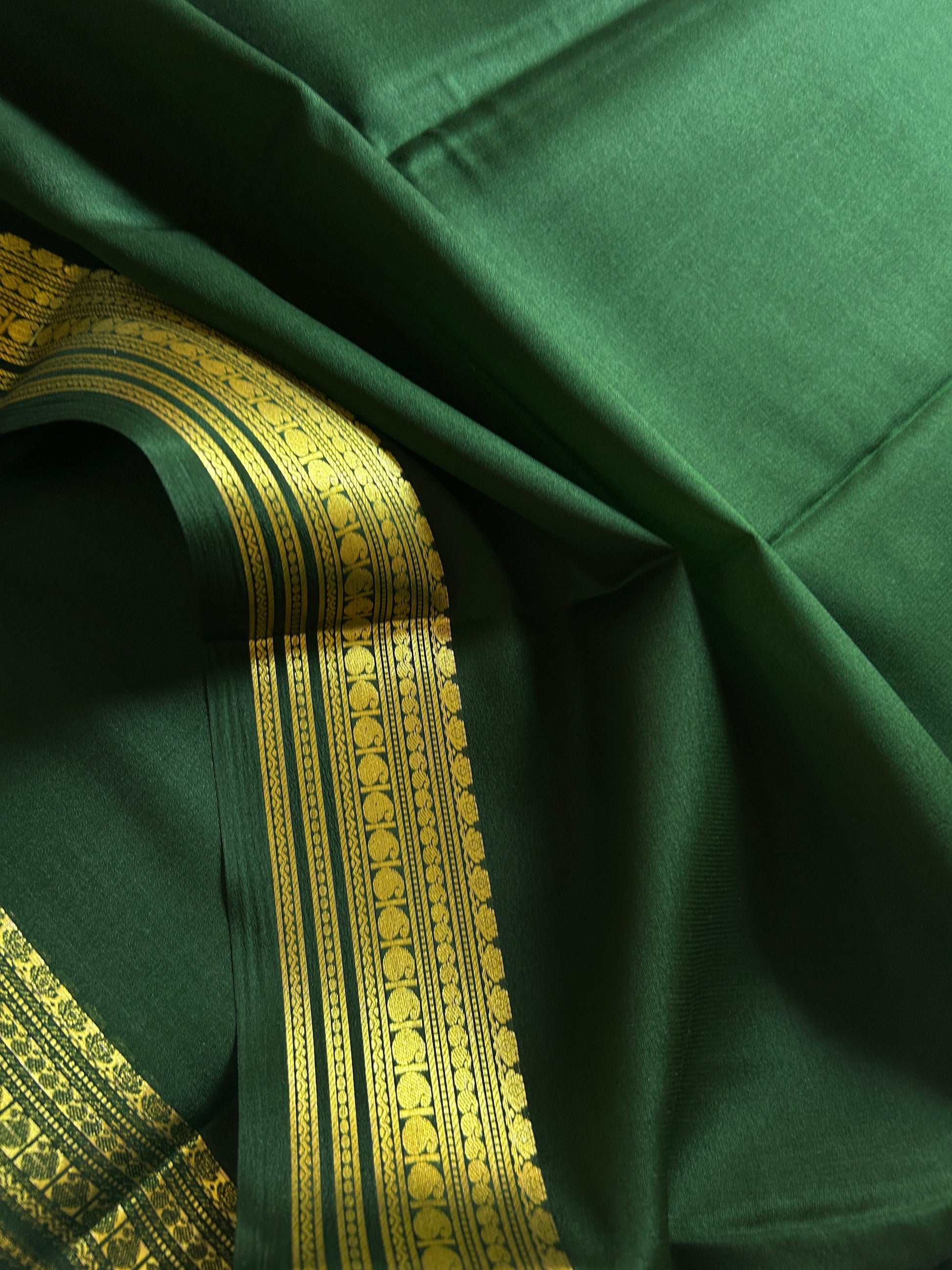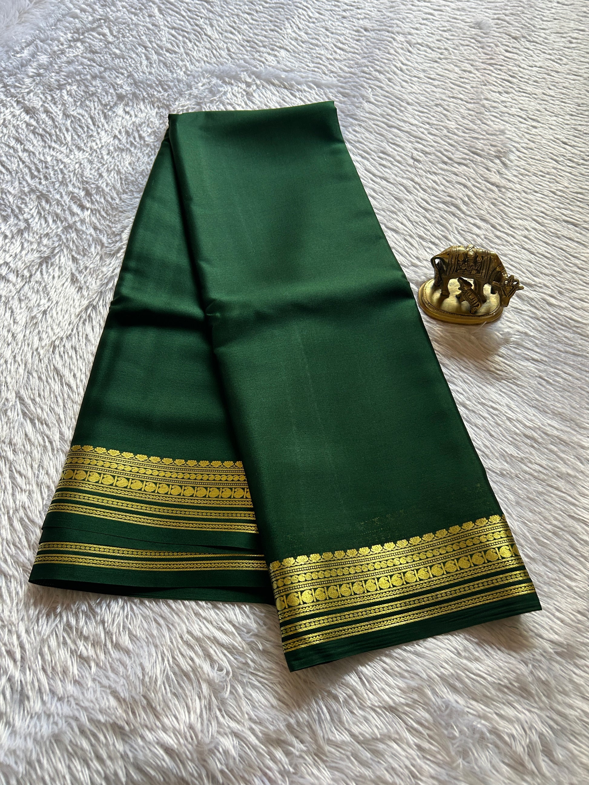 This bottle green saree is made from lightweight pure Mysore crepe silk (60 GSM). Features a beautiful border with detailed zari work. The solid color design makes it perfect for both special occasions and everyday wear.