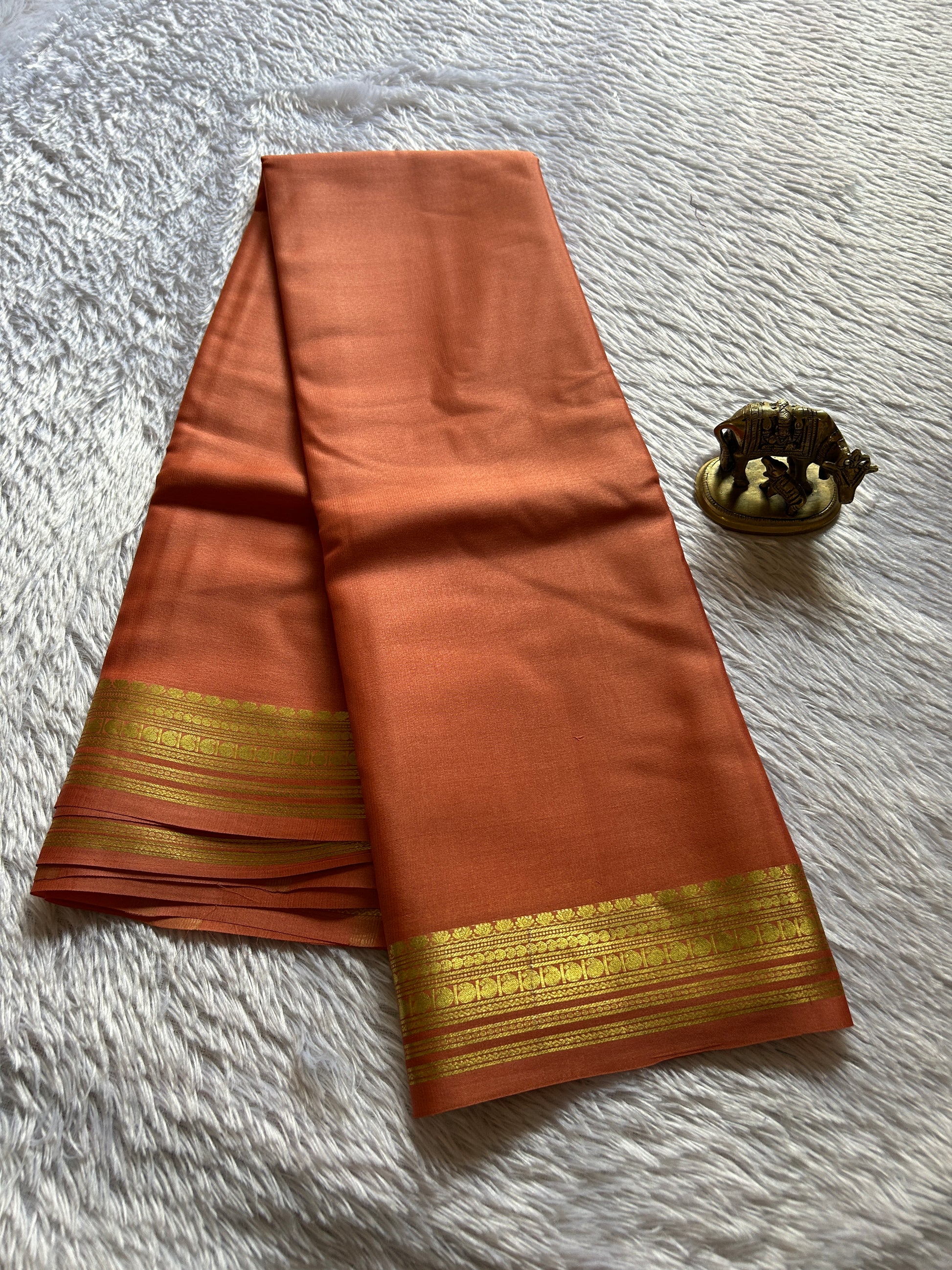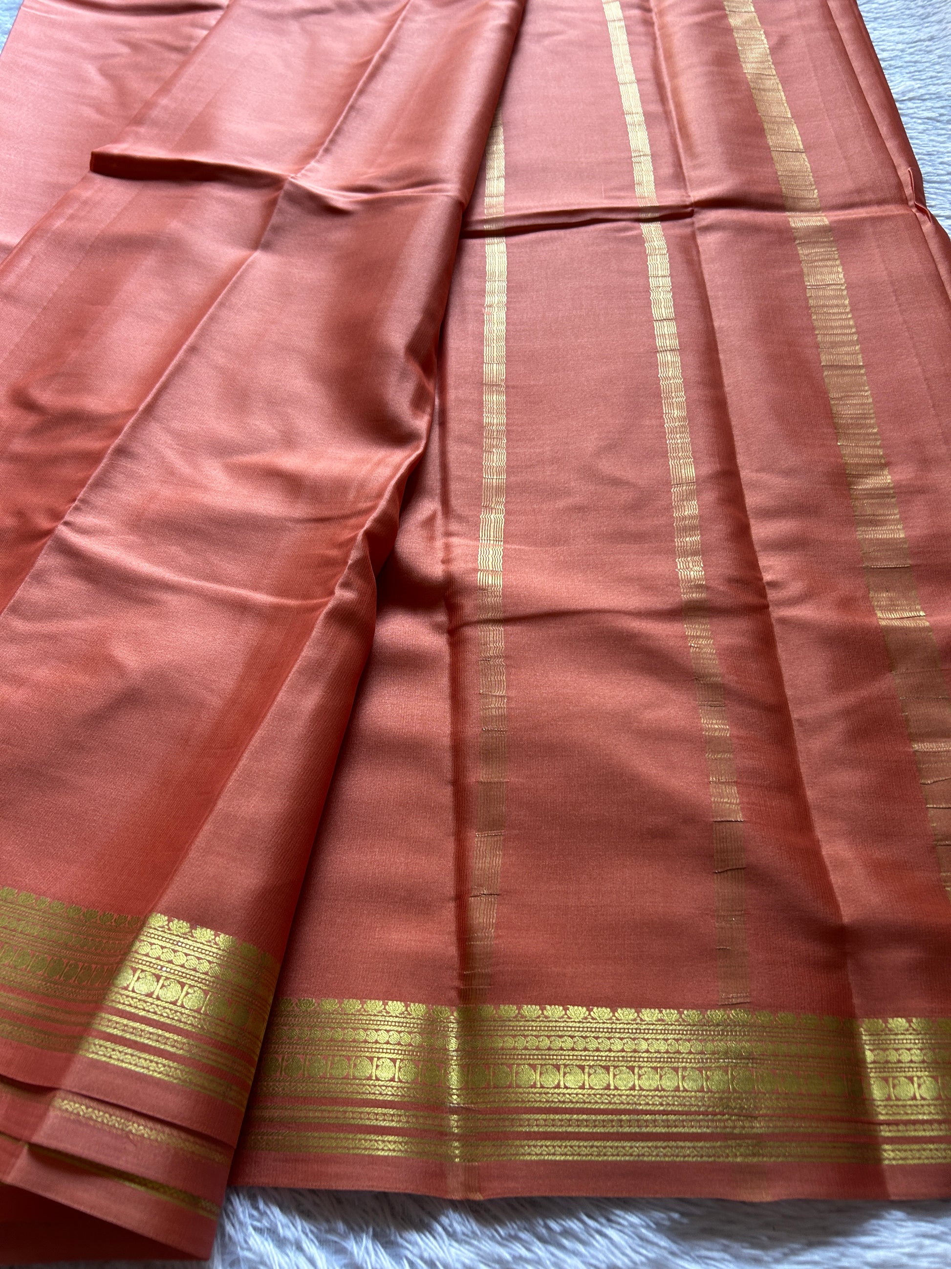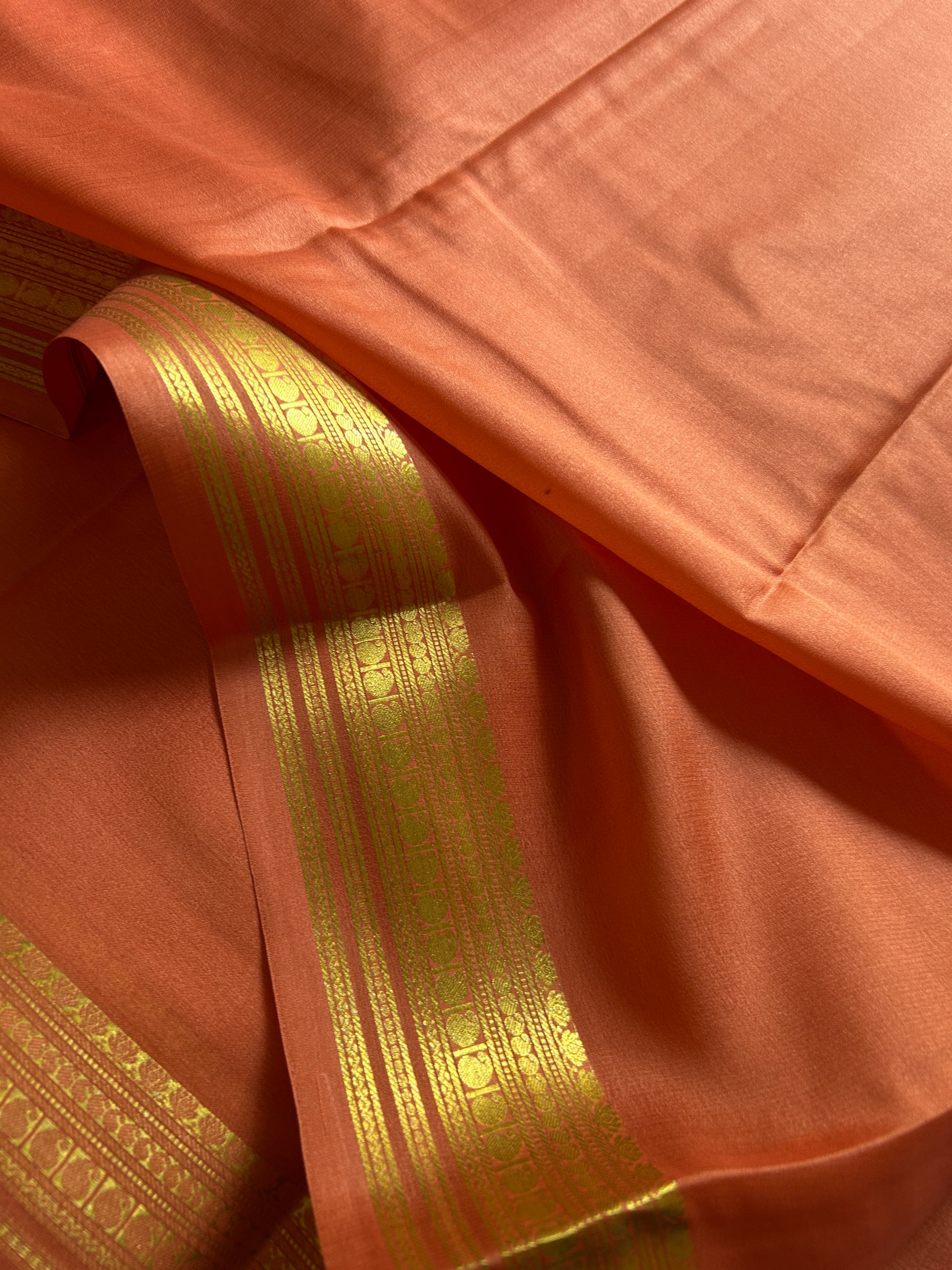 Swara showcases a stunning peach Mysore crepe silk saree in pure silk, meticulously woven at 60 GSM for an exceptionally lightweight feel. The fabric's natural fluidity and subtle sheen exemplify the hallmark elegance of authentic Mysore silk, while its reduced weight ensures comfortable wear without compromising on structure or drape. Adorning the border is intricate zari work that demonstrates masterful artisanal craftsmanship, with each detail reflecting traditional weaving excellence. This saree seamlessly transitions between occasions, offering the wearer a perfect synthesis of refined luxury, breathable comfort, and timeless sophistication rooted in heritage textile traditions.