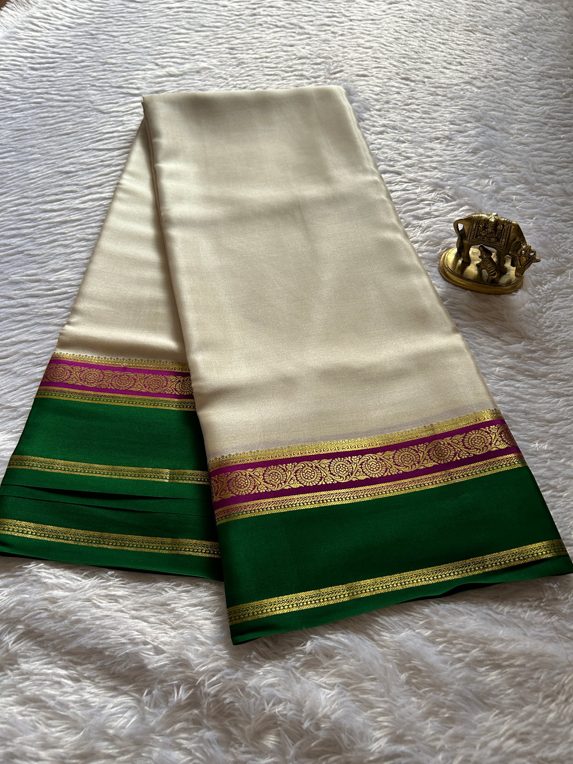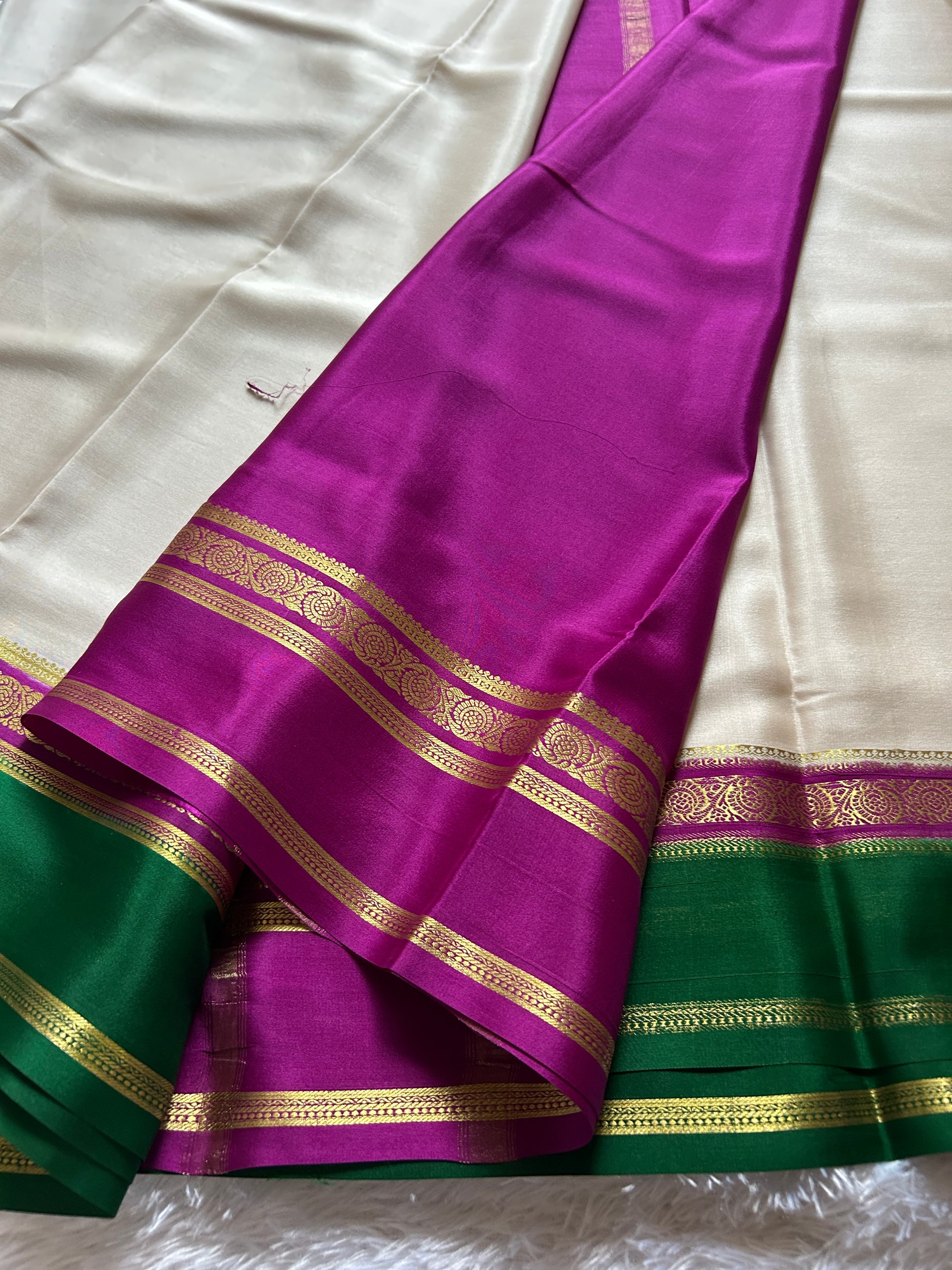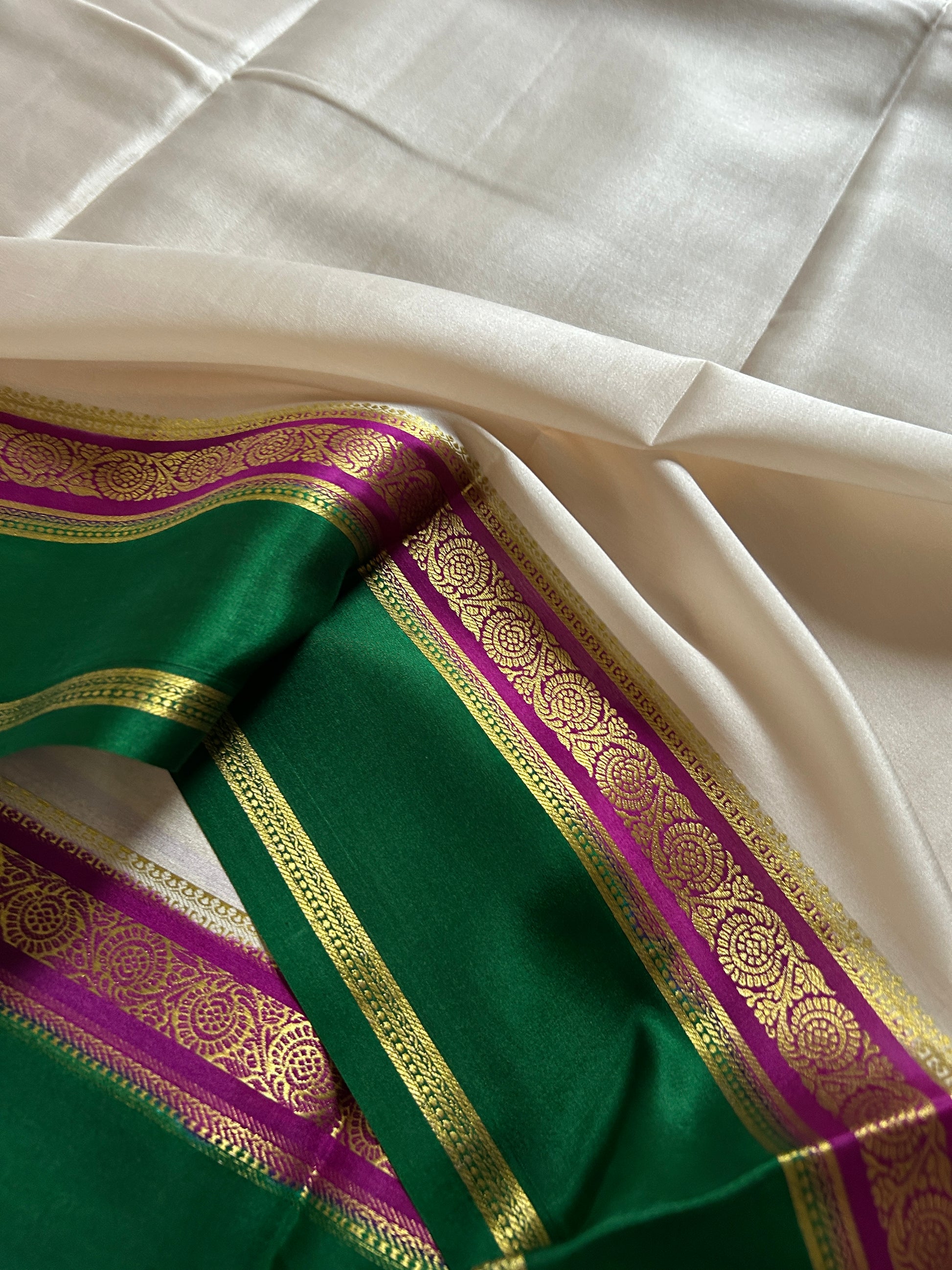 Experience timeless elegance with the Tara saree, crafted from lightweight pure Mysore crepe silk. The off-white body is beautifully contrasted by a striking magenta and green border adorned with intricate zari work, showcasing exquisite craftsmanship. The vibrant magenta pallu complements the matching blouse material, creating a harmonious blend of tradition and style. Perfect for formal occasions, this saree offers both comfort and sophistication, reflecting refined artistry from Mysore’s rich weaving heritage.