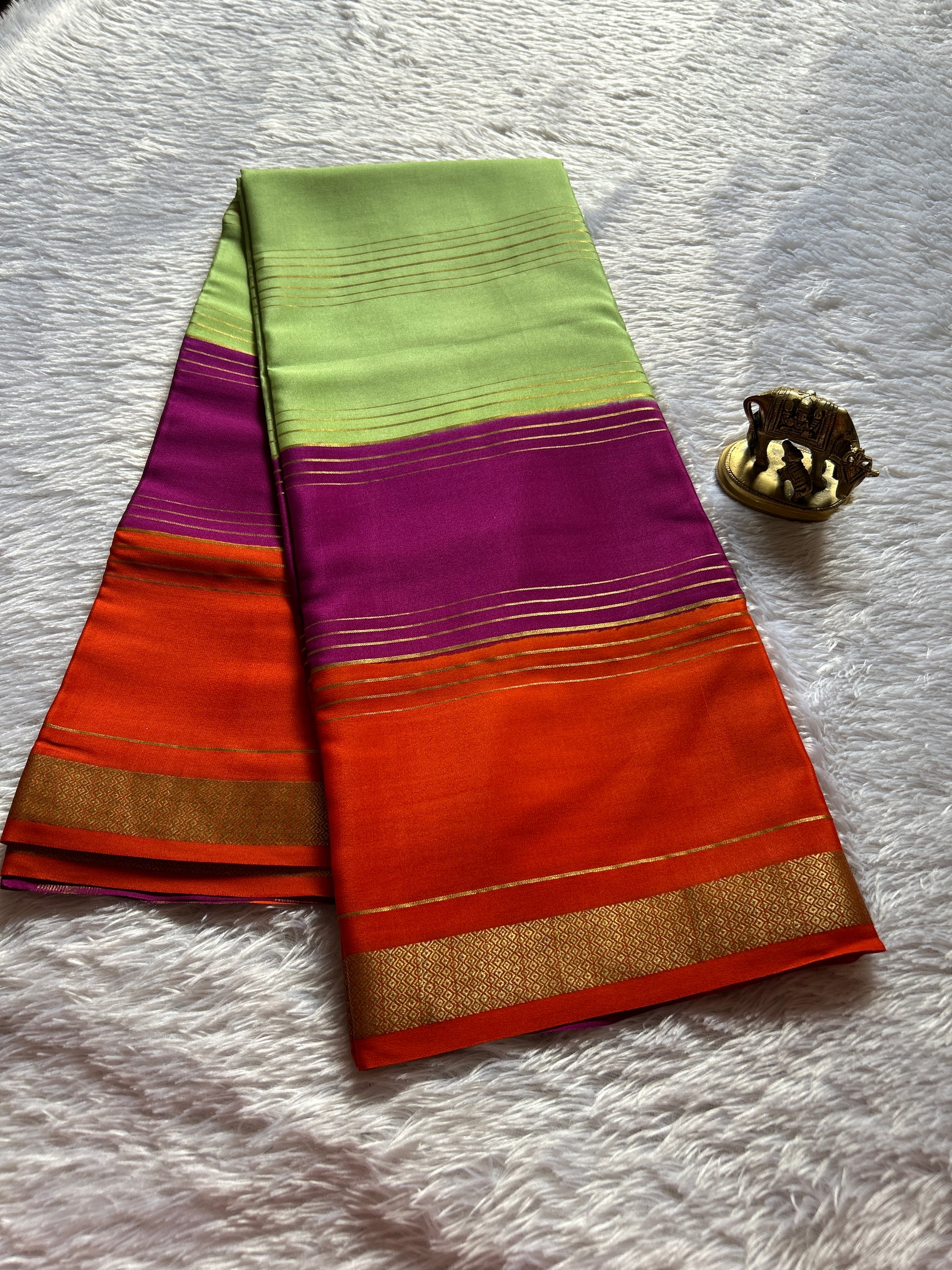 Trinetri celebrates the art of color harmony with its striking three-tone palette. This lightweight pure crepe silk saree features pista green, magenta, and orange woven in horizontal zari stripes that dance across the fabric, creating visual rhythm and movement. The border showcases intricate zari embellishment that frames the piece with understated opulence. The crepe silk construction ensures effortless draping and comfort, while the metallic striping adds dimension without compromising the fabric's fluid nature. Perfect for those who appreciate sophisticated color play and refined craftsmanship.