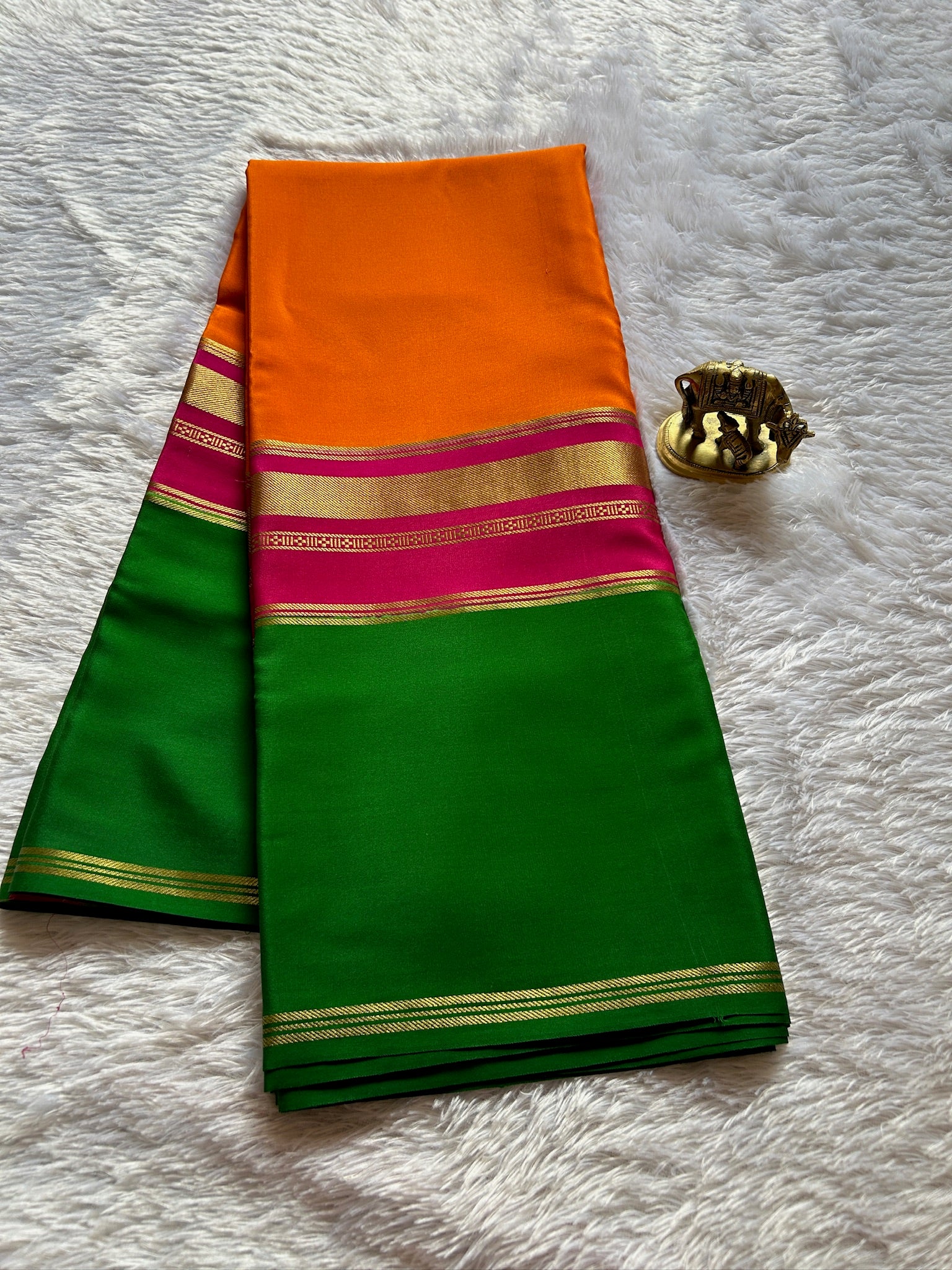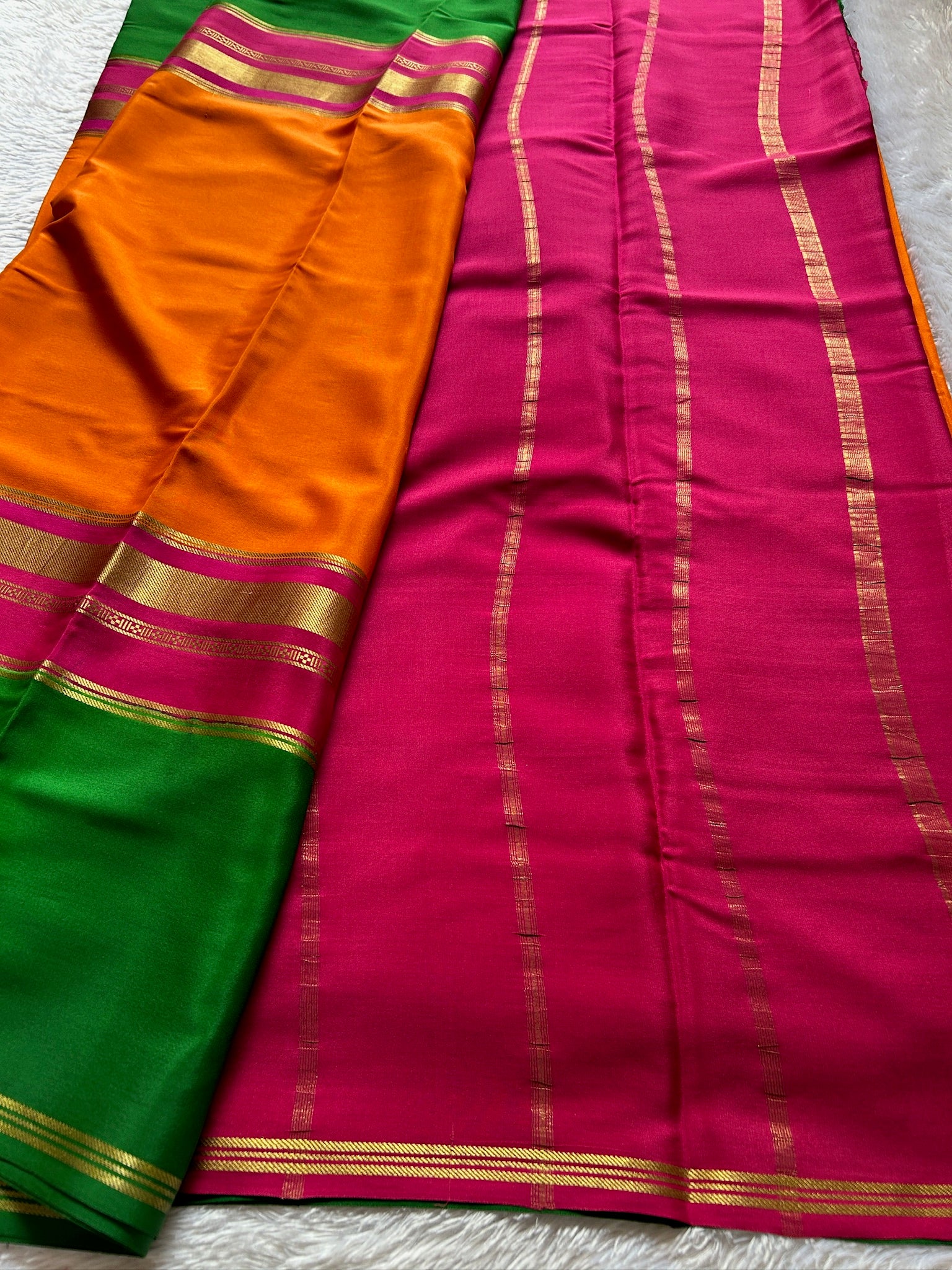 This elegant Mysore crepe silk saree showcases a vibrant orange body complemented by a striking pink and green broad border, adorned with intricate zari craftsmanship. The pink pallu features delicate zari lines that enhance its rich texture, making it an exquisite choice for special occasions where tradition meets sophistication.