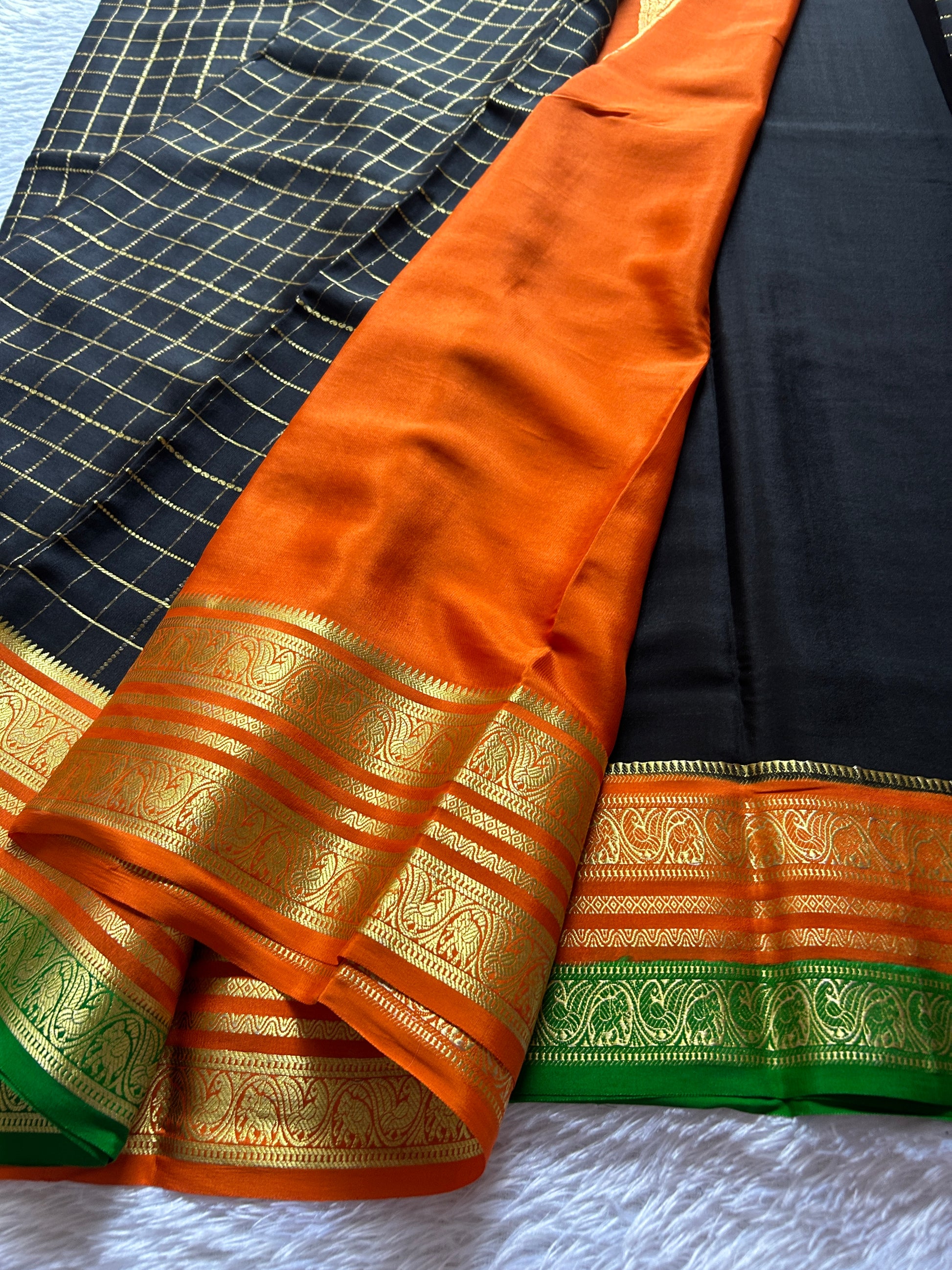 Elevate your ensemble with the Tulasi, a black pure Mysore crepe silk saree featuring elegant zari checks woven throughout. The saree showcases a striking orange and green border accented with intricate zari work, adding refined detail and depth. Complemented by a vibrant orange pallu and matching blouse material, this saree perfectly balances tradition and sophistication.