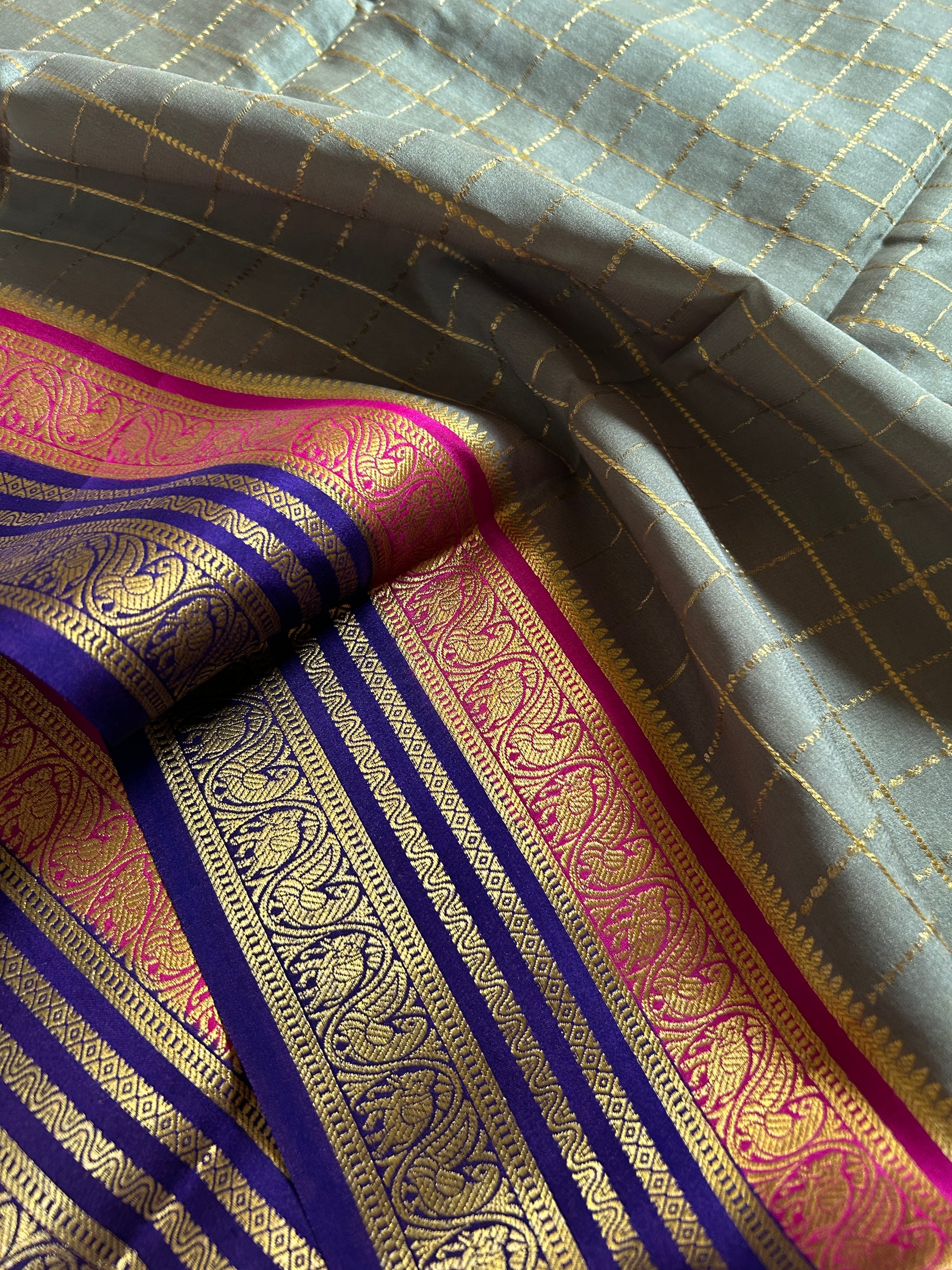 This Tulasi saree features luxurious pure Mysore crepe silk in a subtle sage green, adorned with elegant zari checks throughout. The pink and navy blue border showcases intricate zari craftsmanship, adding refined detail and contrast. Complemented by a rich navy blue pallu and matching blouse material, this saree blends traditional artistry with sophisticated color interplay, making it ideal for special occasions and cultural events. Its breathable silk fabric ensures comfort while maintaining a graceful drape.