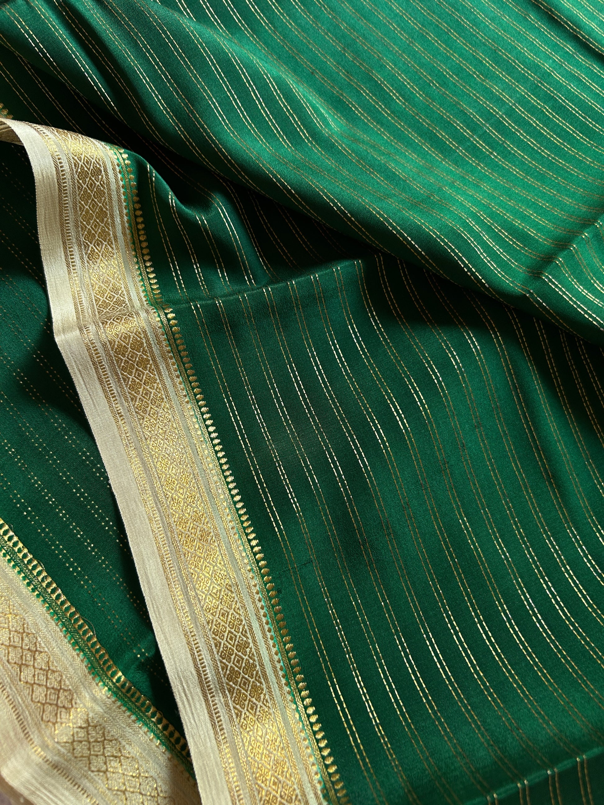 Elevate your collection with this sophisticated Mysore silk saree in bottle green, distinguished by its refined horizontal zari lines that create an understated geometric elegance across the fabric. The luxurious pure silk drape offers a fluid, graceful silhouette, while the off-white border adorned with intricate zari work provides a striking contrast that frames the piece beautifully. Perfect for festive occasions and formal gatherings, this timeless design combines traditional craftsmanship with contemporary aesthetics, ensuring you make a refined statement with every wear.