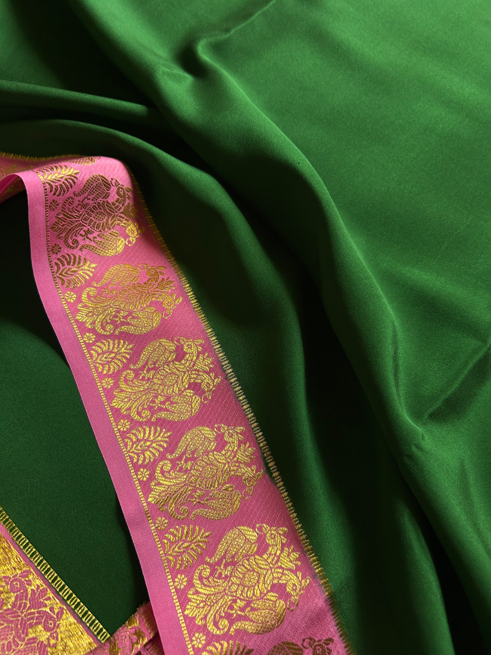 Drape yourself in elegance with this stunning bottle green Mysore crepe silk saree. Crafted from pure silk with a luxurious 110 GSM weight, it offers a graceful drape and comfortable wear. The saree features a striking rose pink border adorned with intricate Gandaberunda motifs in pure copper silver silk (CSS) zari. This traditional design combines timeless craftsmanship with refined aesthetics, making it perfect for celebrations, festivals, and special occasions. A versatile piece that brings sophistication to your ethnic wardrobe.