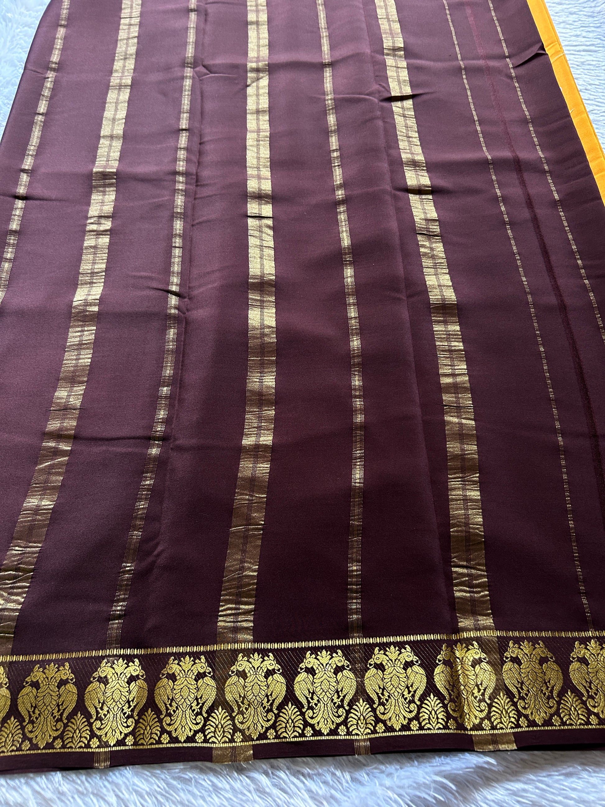 Drape yourself in timeless elegance with this stunning Mysore crepe silk saree. Crafted from pure silk with a luxurious 110 GSM weight, it features a radiant golden yellow base complemented by a rich deep brown border. The border showcases intricate Gandaberunda motifs rendered in pure copper silver silk (CSS) zari, adding a regal touch to this classic design. Perfect for weddings, festivals, and special occasions, this saree combines traditional craftsmanship with sophisticated color harmony.