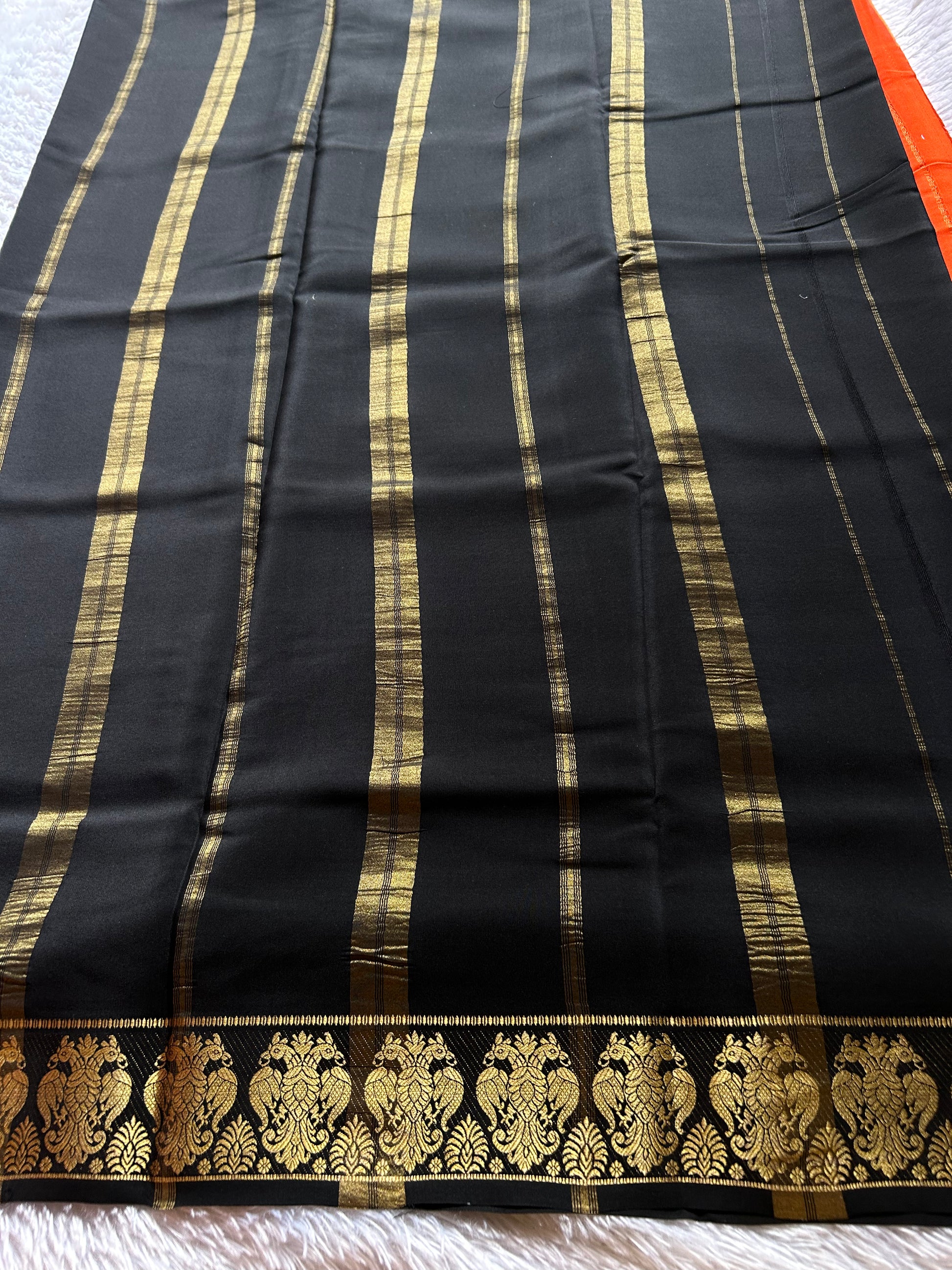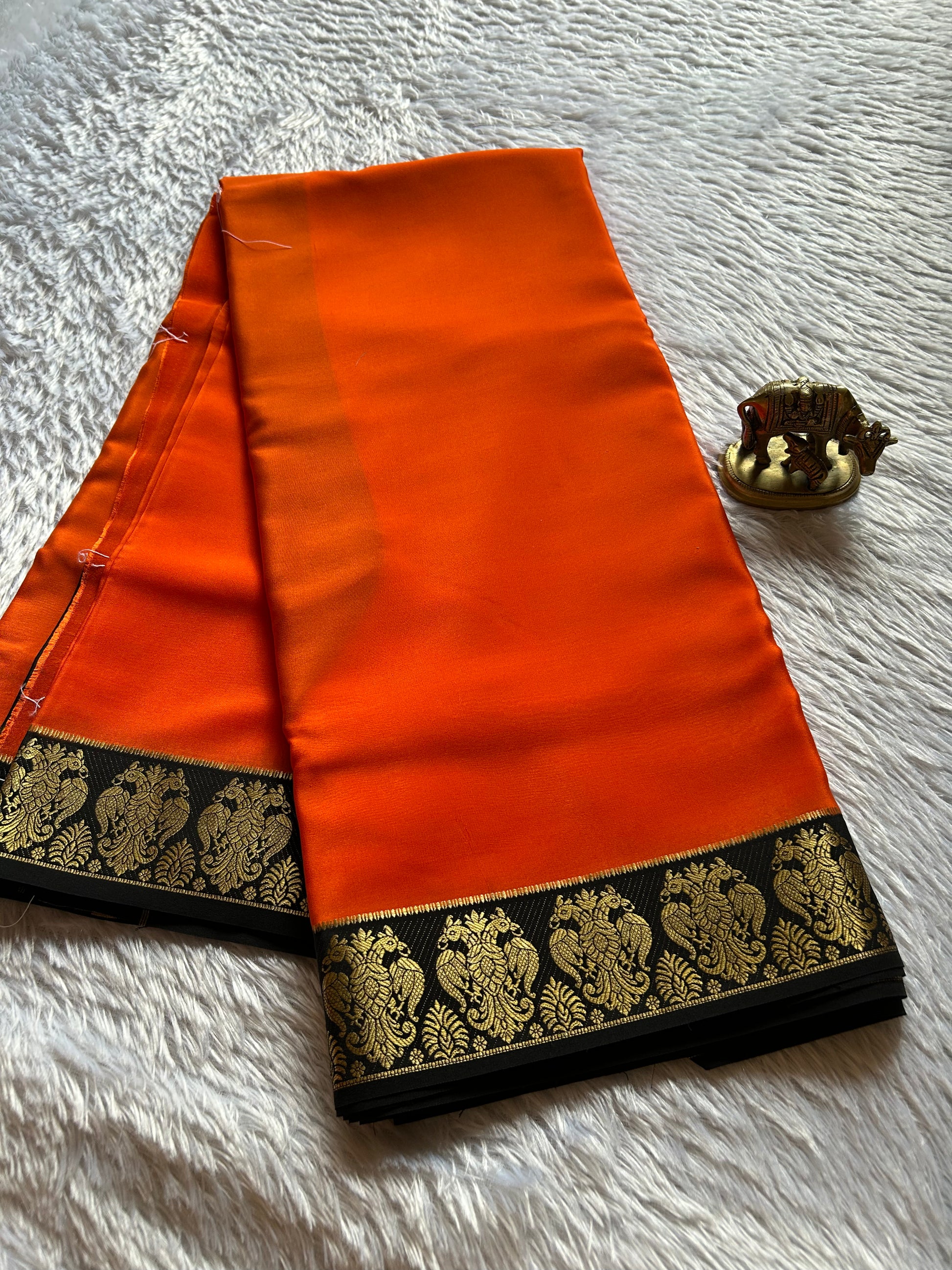Draped in luxurious pure CSS(Copper Silver Silk) zari Mysore crepe silk, this 110 GSM saree showcases a vibrant orange palette complemented by a striking black border. The fabric's refined texture offers graceful drape and comfortable wear throughout the day. Intricate traditional CSS zari GandaBerunda motifs adorn the border, featuring the legendary two-headed eagle in exquisite detail—a timeless symbol of strength and protection in classical Indian design. This piece seamlessly blends heritage craftsmanship with contemporary elegance, making it an ideal choice for festive occasions and celebrations.