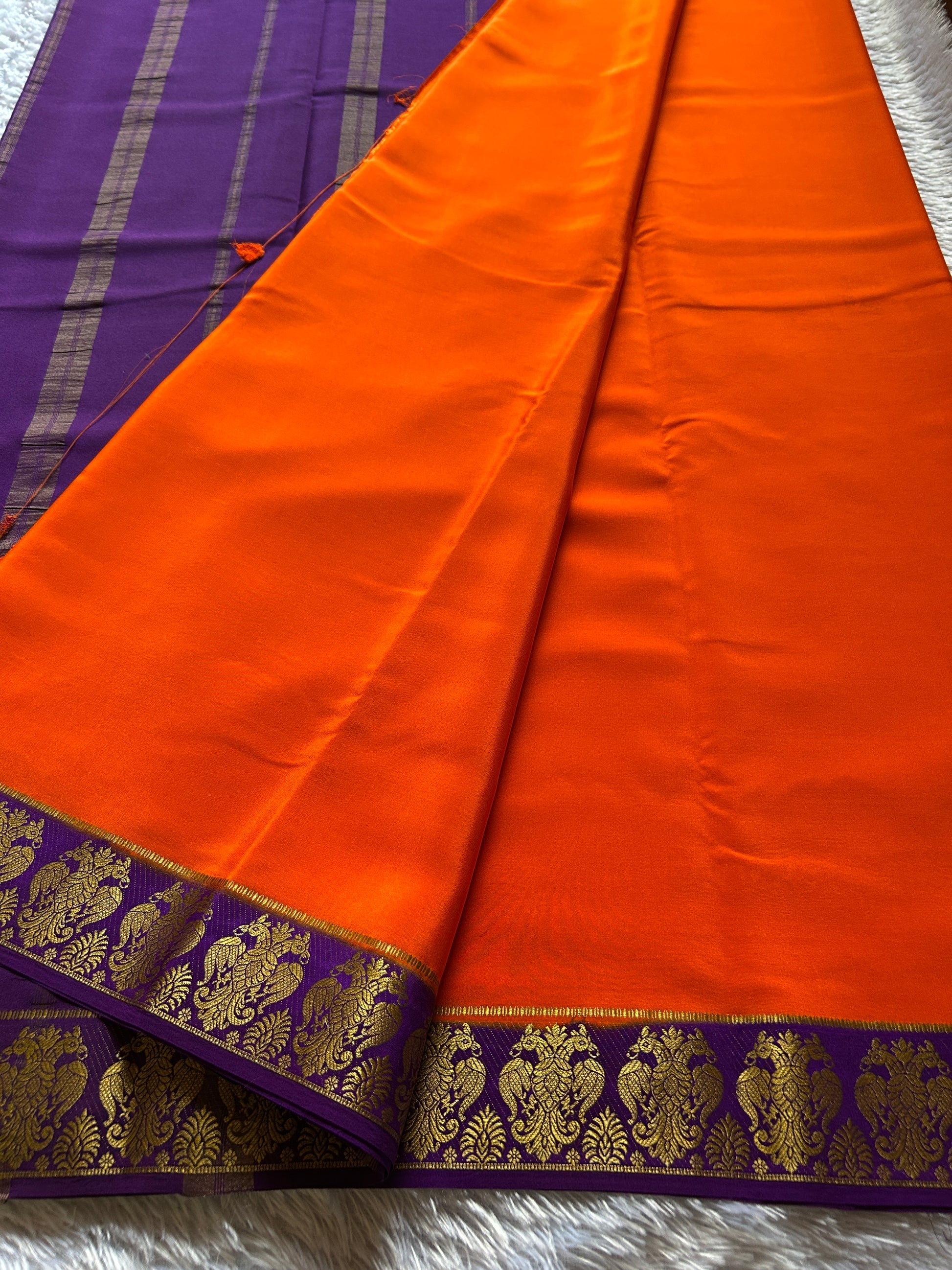 Experience the grace of traditional weaving with this orange Mysore crepe silk saree. Made from pure silk at 110 GSM weight, it delivers a smooth, flowing drape ideal for any occasion. The violet border showcases exquisite Gandaberunda motifs rendered in pure copper silver silk (CSS) zari, bringing out the majestic heritage of South Indian textile art. The warm orange tone paired with regal purple creates a sophisticated palette that works beautifully for festivals, celebrations, and formal events. A timeless piece that honors authentic craftsmanship.