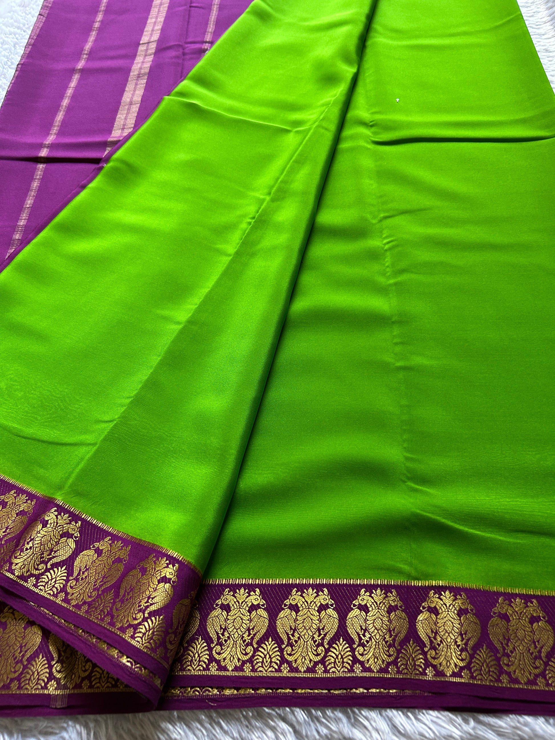 This parrot green Mysore crepe silk saree showcases authentic South Indian craftsmanship at its finest. Woven from pure silk with a 110 GSM weight, it drapes beautifully while maintaining its shape. The magenta border features the iconic Gandaberunda motif adorned with pure copper silver silk zari, creating a luxurious finish. Ideal for weddings, temple visits, and festive celebrations, this saree is a timeless investment piece that honors traditional weaving techniques.