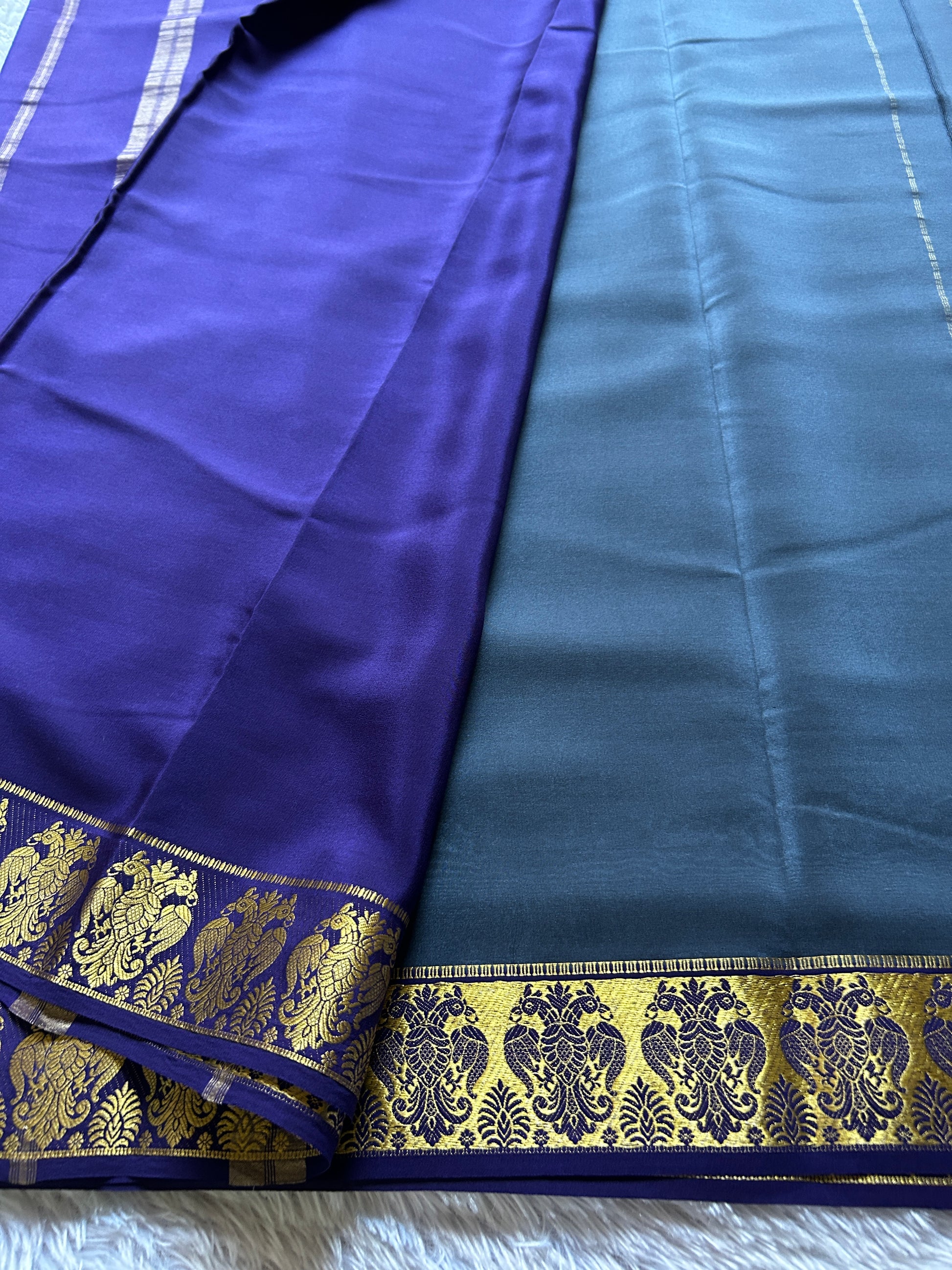 Experience the beauty of traditional weaving with this steel blue Mysore crepe silk saree. Made from premium 110 GSM fabric, it offers a smooth drape and comfortable wear. The navy blue border showcases exquisite Gandaberunda motifs in pure copper silver silk (CSS) zari, bringing classical design to life. Ideal for weddings, festivals, and special occasions, this saree blends heritage craftsmanship with refined elegance.