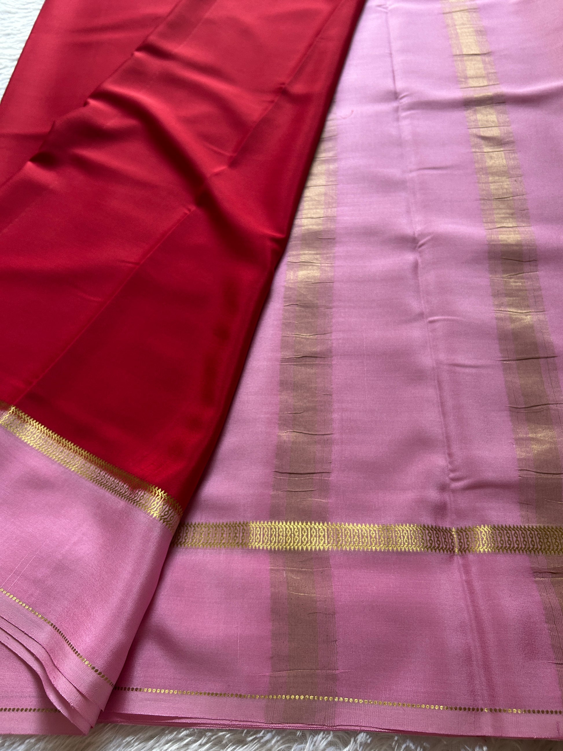 Elevate your collection with this striking red Mysore crepe silk saree, a masterpiece of traditional craftsmanship. The luxurious pure silk fabric drapes with effortless grace, offering the perfect balance of comfort and sophistication. A delicate baby pink gap border adorned with intricate zari work frames the pallu and hem, creating a refined contrast that catches light beautifully. Ideal for weddings, festivals, and special occasions, this saree embodies timeless elegance with contemporary appeal. The fine crepe texture ensures a flattering silhouette while the precious metal threadwork adds an unmistakable touch of luxury.