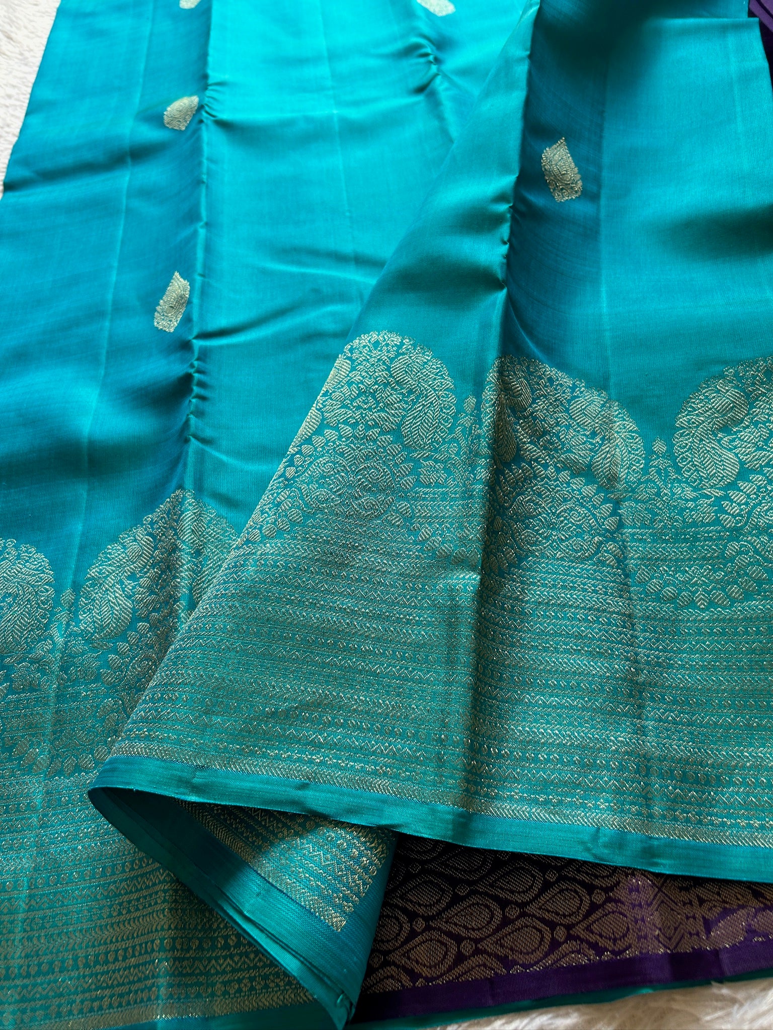 Elevate your traditional collection with the Vydurya Ananda Blue saree crafted from pure Kancheepuram silk. This saree showcases a rich, solid ananda blue body adorned with extensive zari buttas, complemented by an opulent big zari work border. The contrasting violet pallu features intricate zari designs that enhance its regal appeal. Included is a matching violet blouse material, perfect for a refined, cohesive look. Ideal for festive occasions and weddings, this piece exemplifies expert craftsmanship and timeless elegance.
