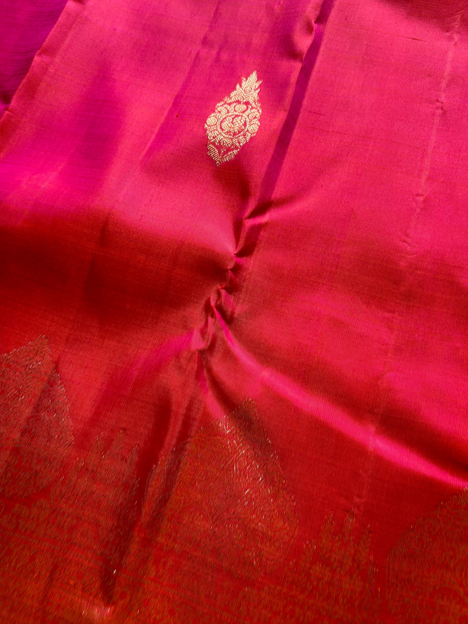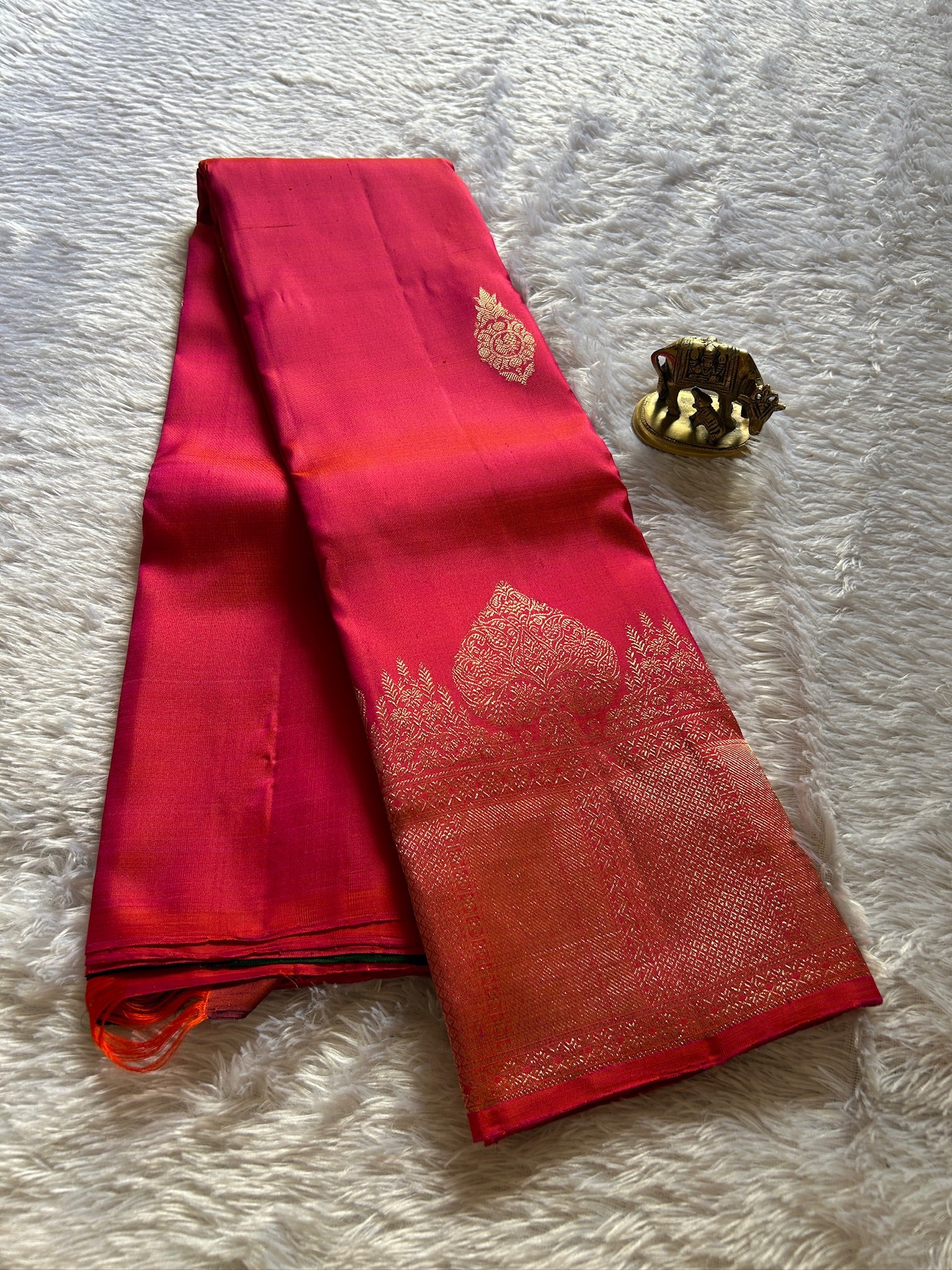 Experience timeless elegance with the Vydurya saree, crafted from pure Kancheepuram silk in a captivating pinkish red shade. It features a rich, broad zari border and delicate zari buttas spread across the fabric, enhancing its opulence. The contrasting bottle green pallu is adorned with intricate zari work, perfectly complemented by matching bottle green blouse material. This saree brings together traditional craftsmanship and luxurious design, ideal for festive occasions and celebrations.